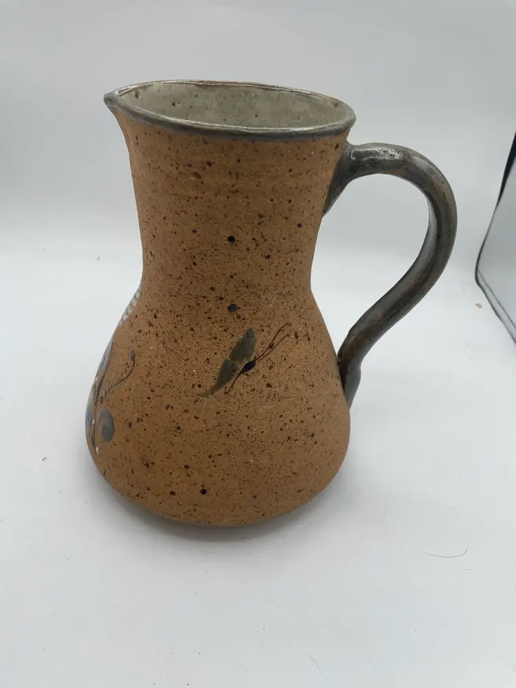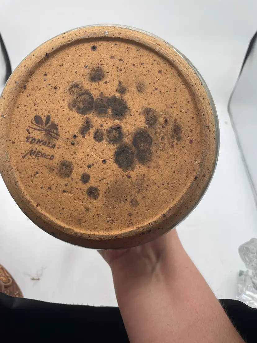 Tonala pottery pitcher with a bird on it No chips or cracks Not sure what the black spots on the bottom are.