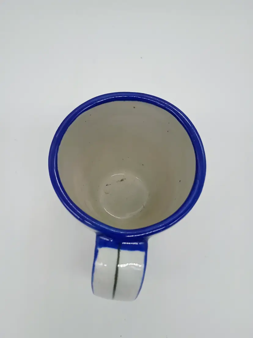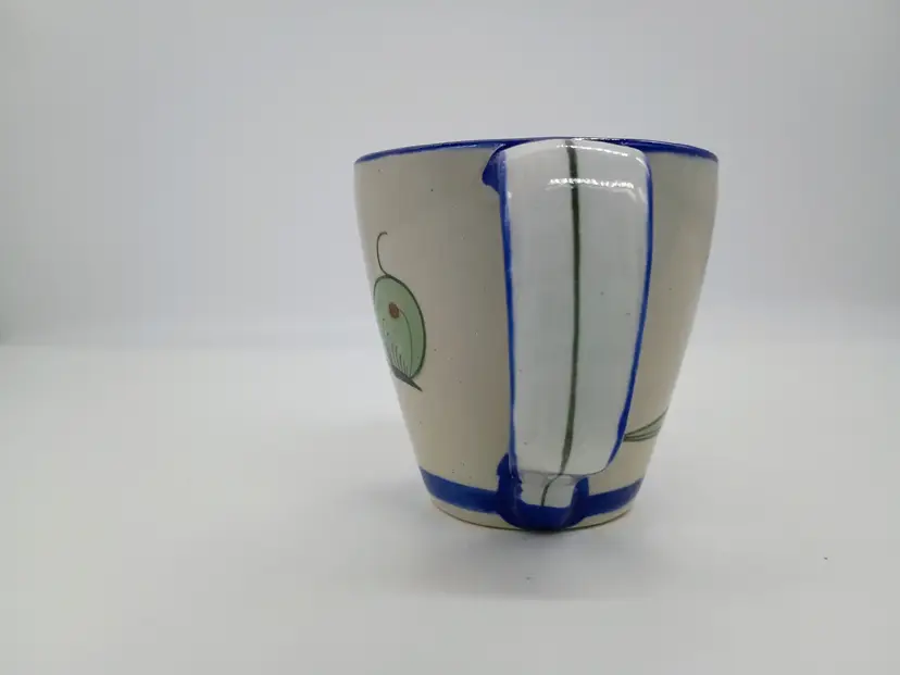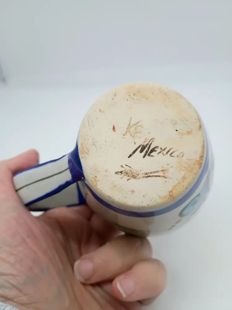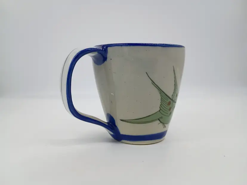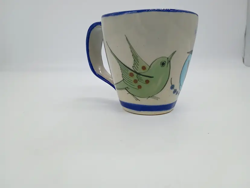 Signed Ken Edwards Pottery Bird Flower Mug Tea/Coffee Cup El Palomar Mexico. This has about an 11-12oz max capacity. It is 4.75 handle to rim and 3.5 tall and in diameter. Design features a bird a flower and a butterfly. Cobalt blue details on rim bottom and handle. This is preowned, No chips cracks or flea bites, No utensil marks no interior stains. Glaze is intact. Passed hot water test no leaks, Handle is secure. Signed on bottom Excellent condition. Ships USPS domestically and USPS international Shipping globally