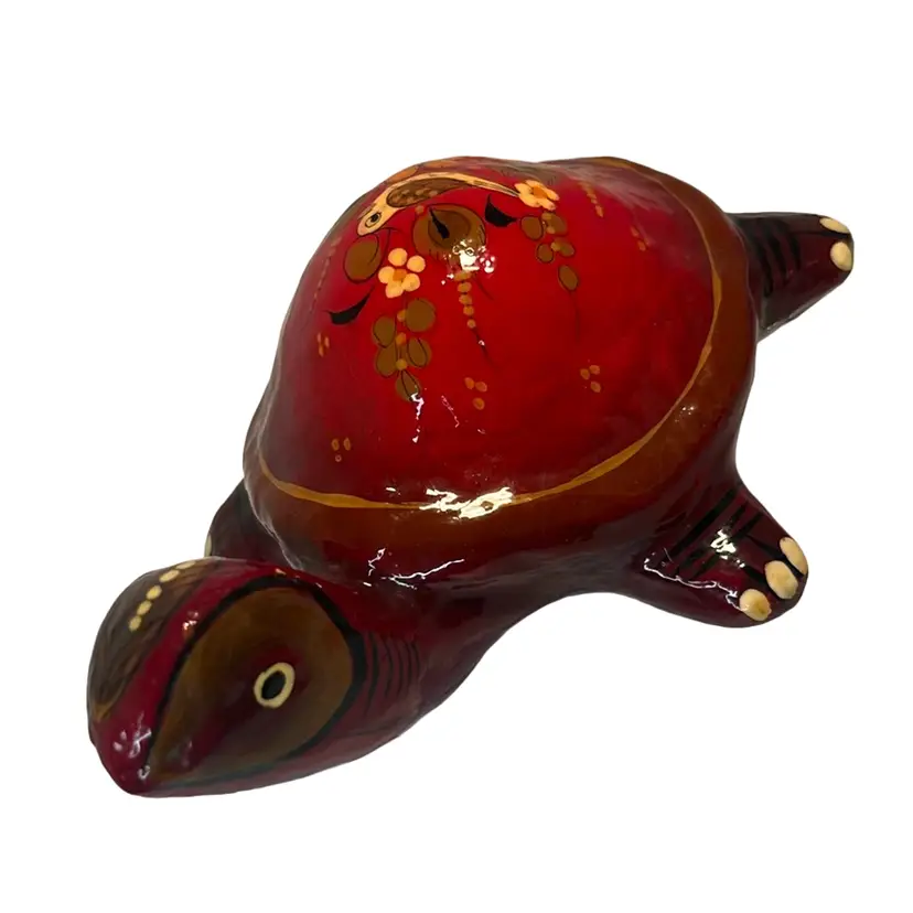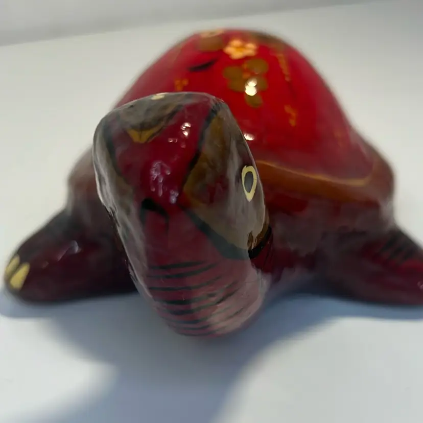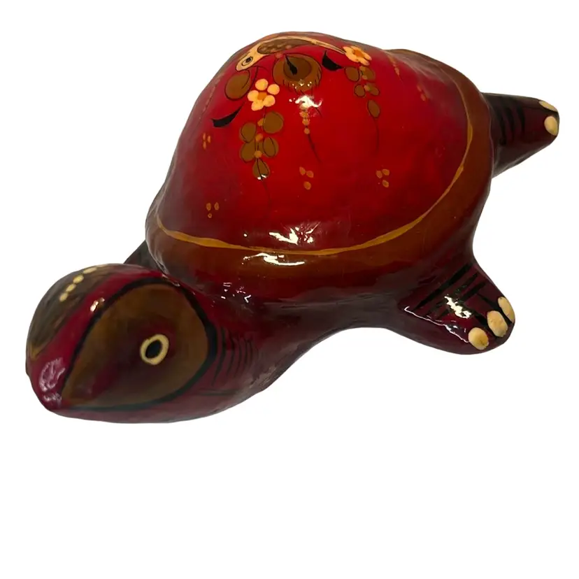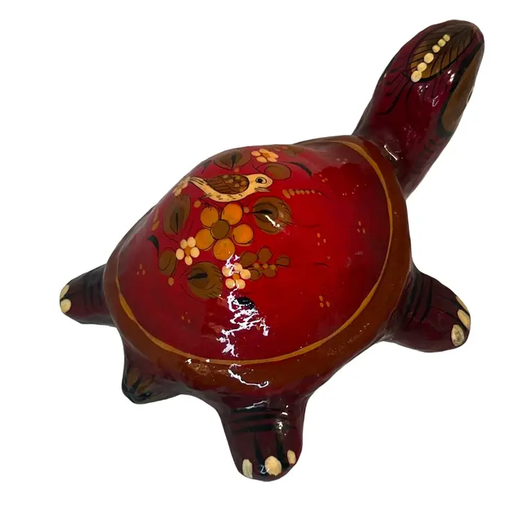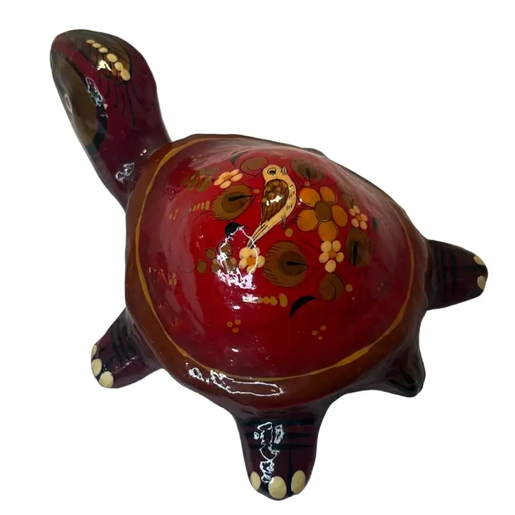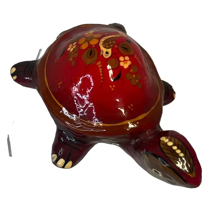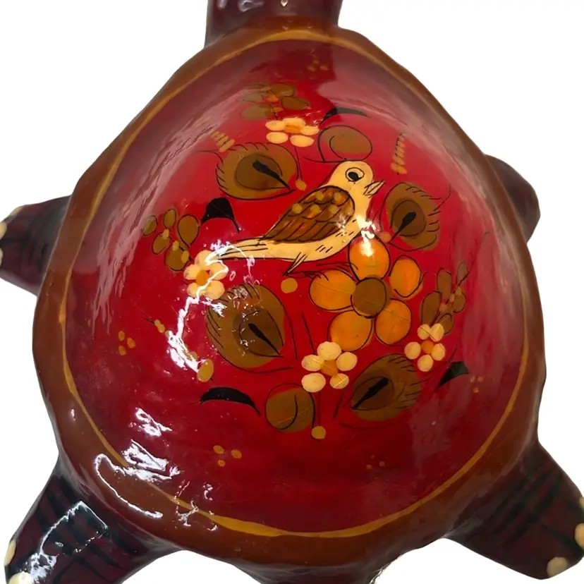 Very sweet red paper mache turtle with hand painted bird and flowers. Signed Ser Mel.