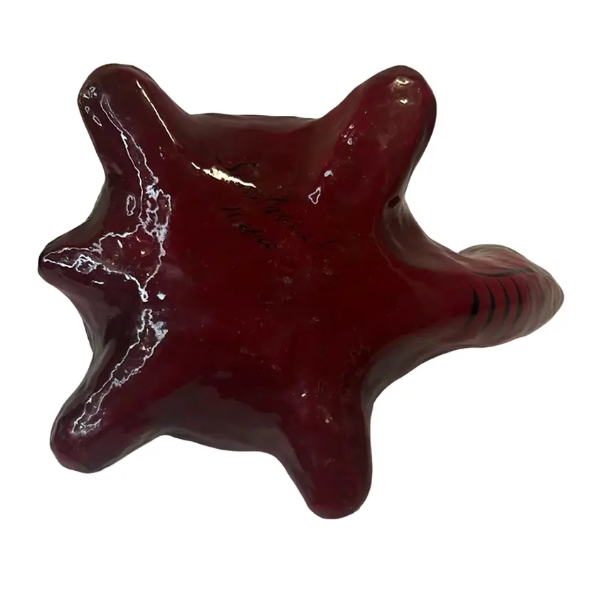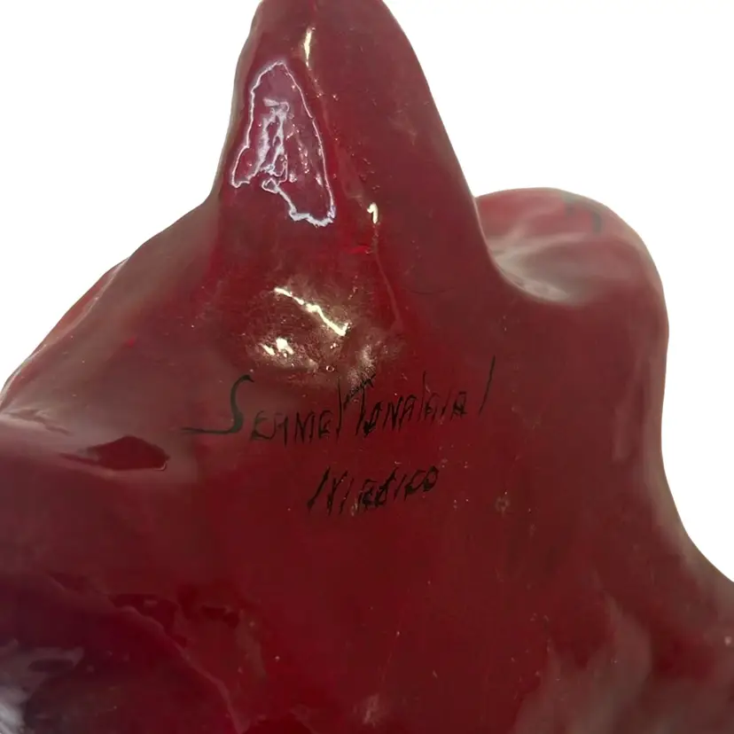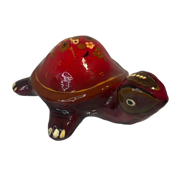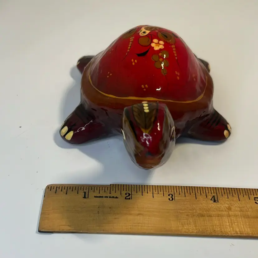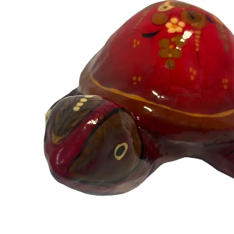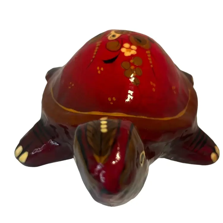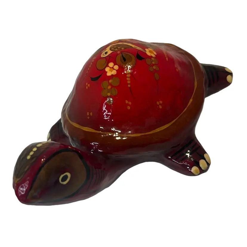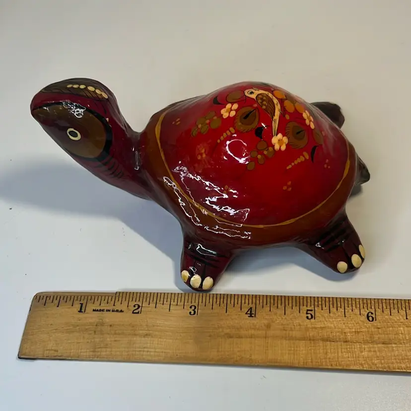 Very sweet red paper mache turtle with hand painted bird and flowers. Signed Ser Mel.
