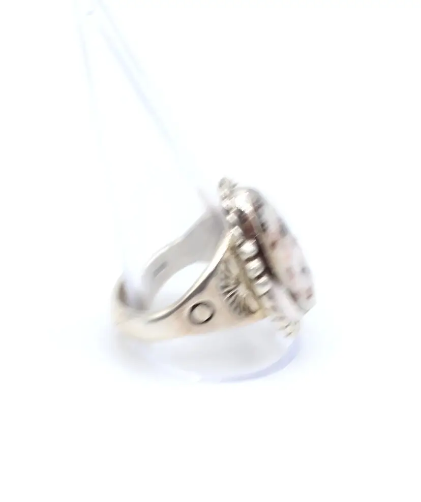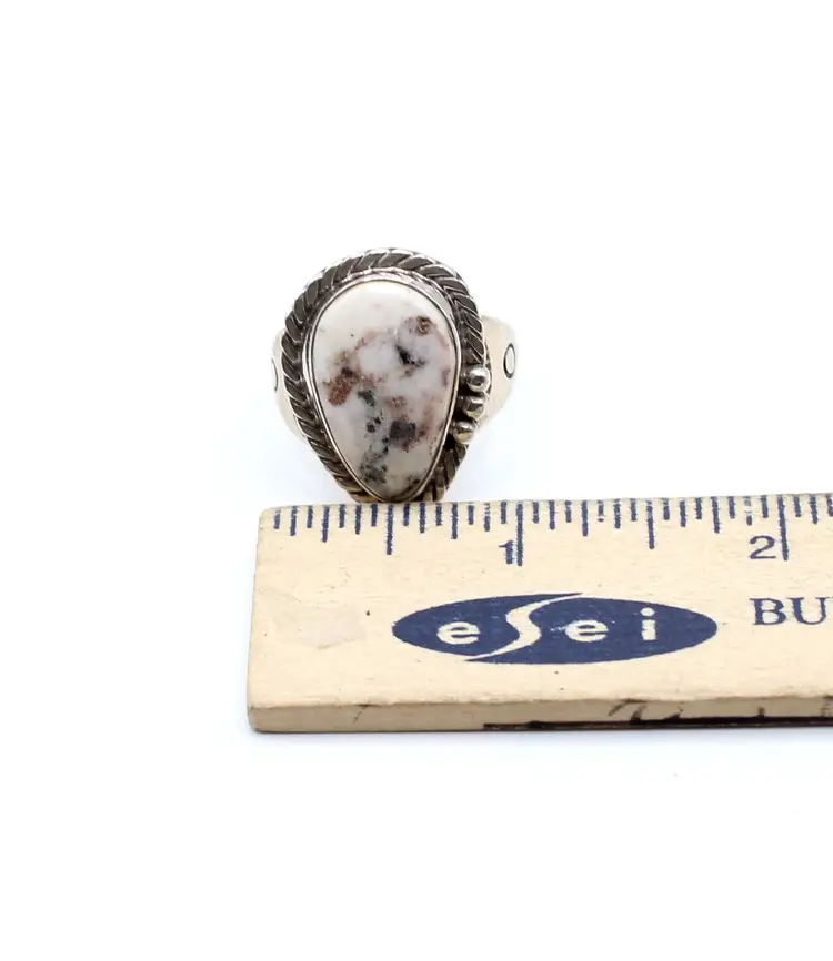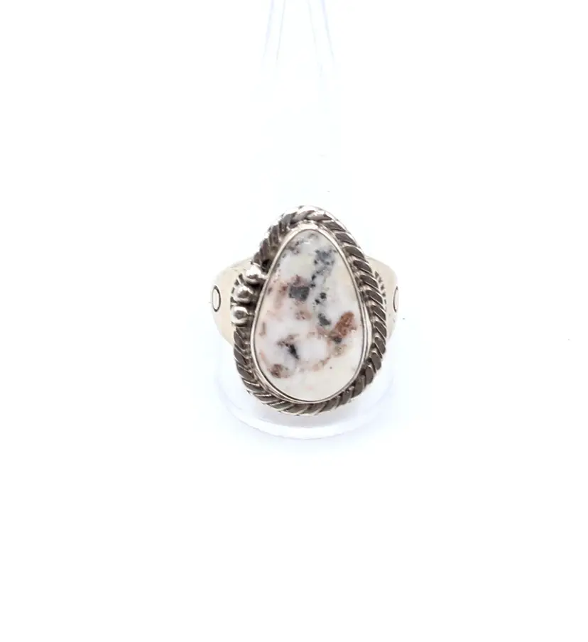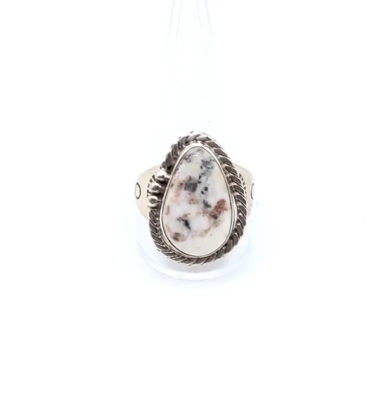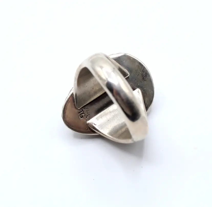 Beautiful ring signed TG assumed Tony Garcia to unknown artist. Stone is set in a smooth bezel with twisted wire design set on a hand stamp 5.49mm comfort band.