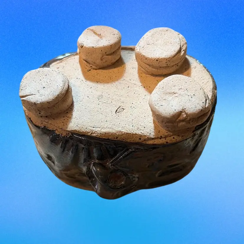 This is a toothpick holder. It measures approximately 3” x 1 1/2” and there’s 2 1/2 inches tall it is handcrafted from clay.