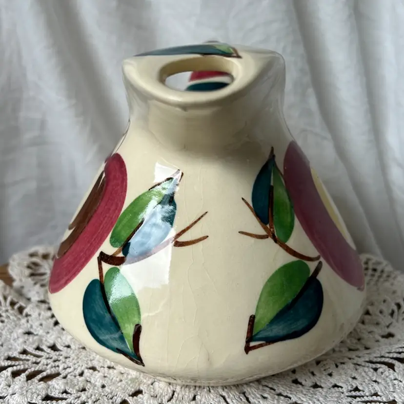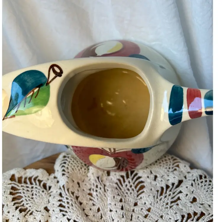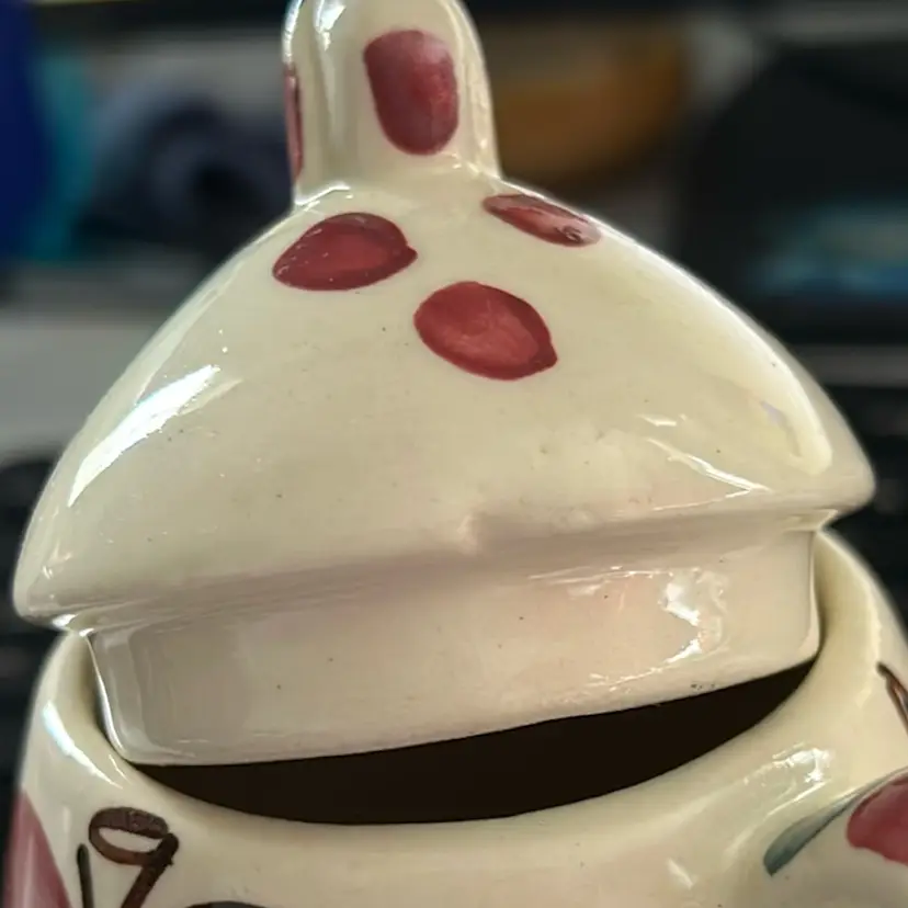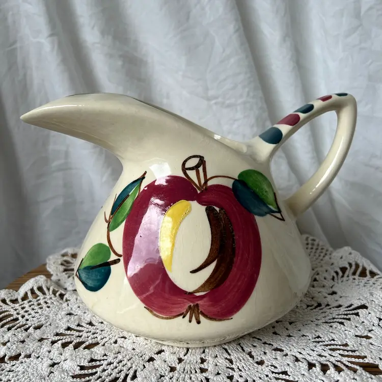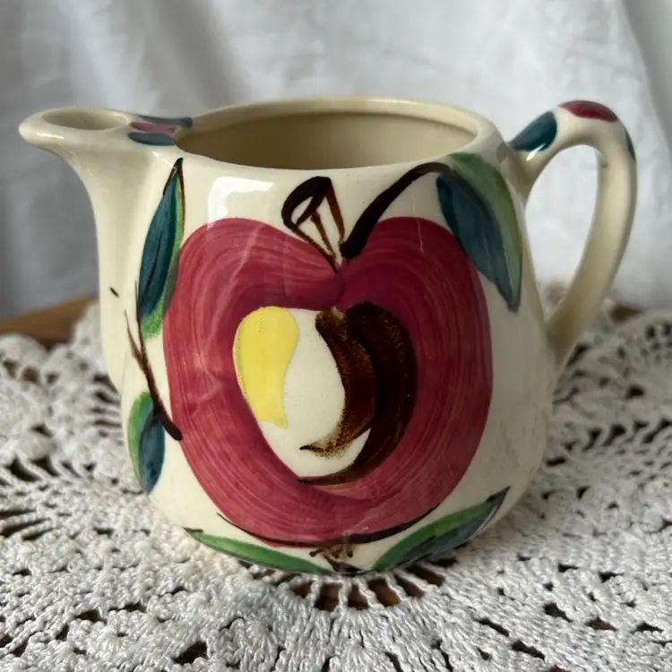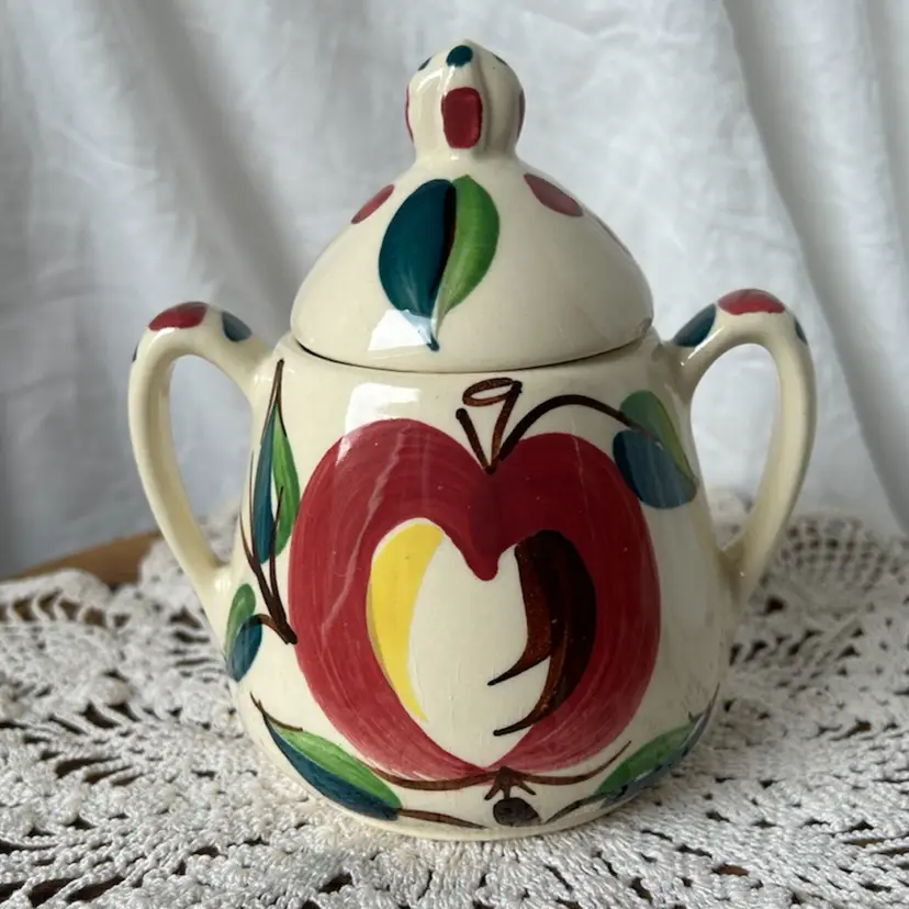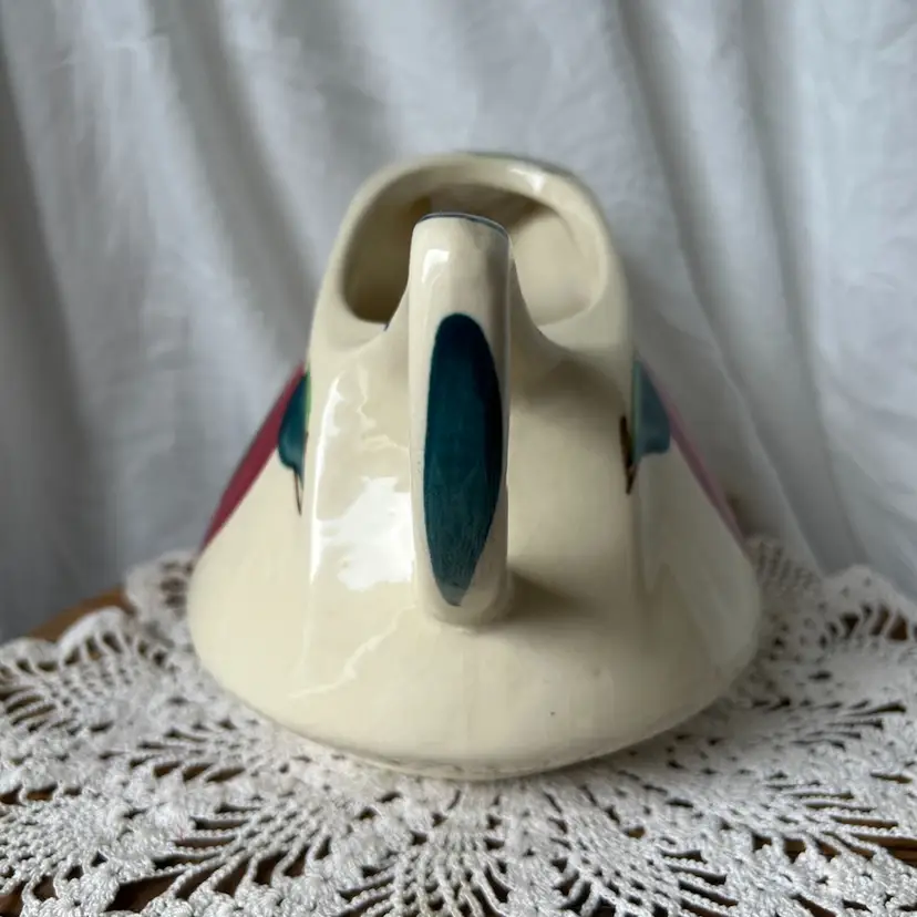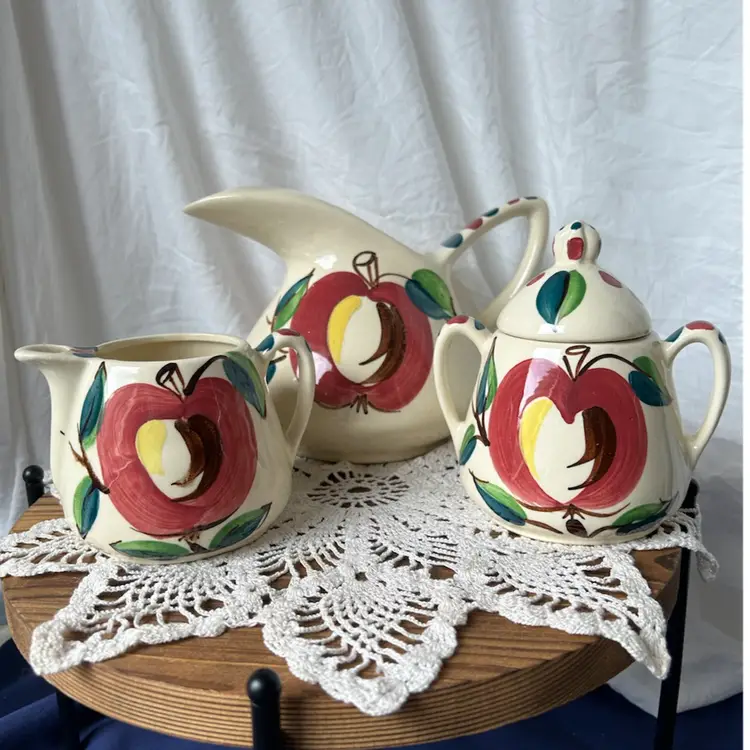 All 3 pieces are in VGC with no chips or cracks and are solid pieces of pottery. The pitcher measures 5.5β tall by 8β across from spout to handle, and has age related crazing. The creamer measures 5.5β wide from spout to handle, 4β tall, and has age related crazing. The covered sugar bowl measures @6β tall by 5.5β wide and does have an imperfection under the glaze on the lid. See the last pic, please.