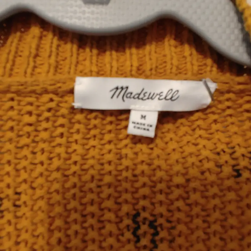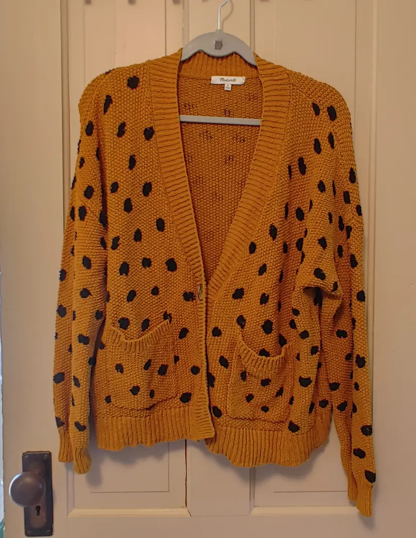 Top- Brand: Madewell. Brown cardigan with black spots. Size Medium. Material- 100% cotton. No callouts.