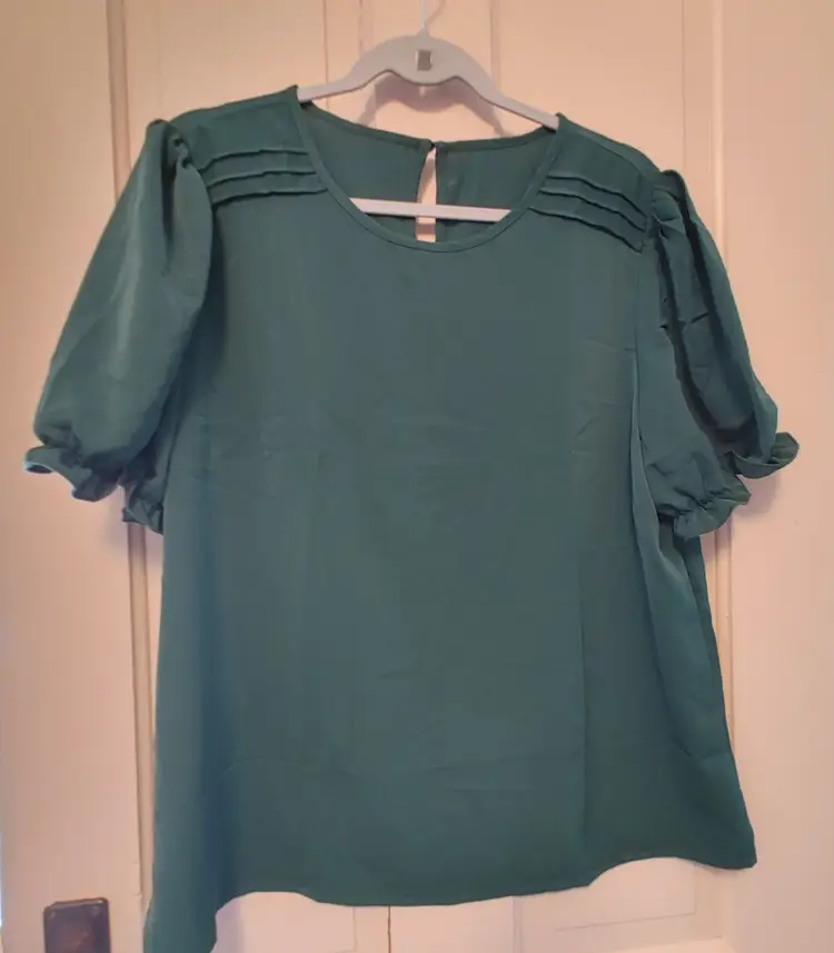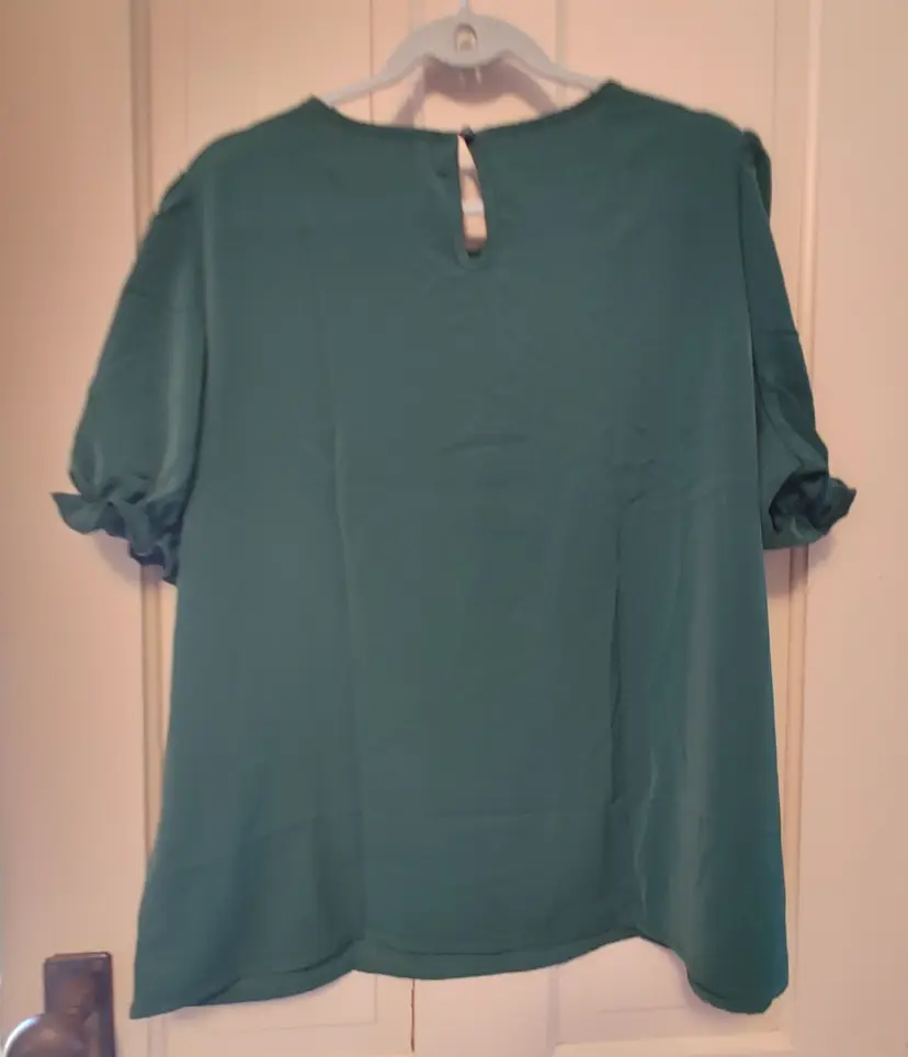 Top- Brand: Unknown. Solid green top. Size XL. Material- 95 polyester, 5 spandex. No callouts.