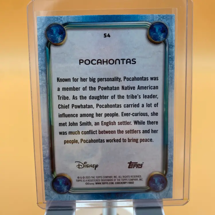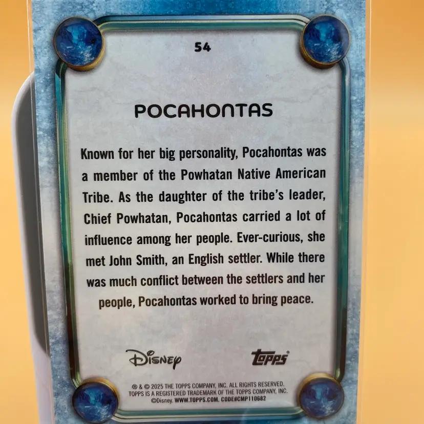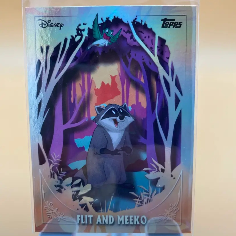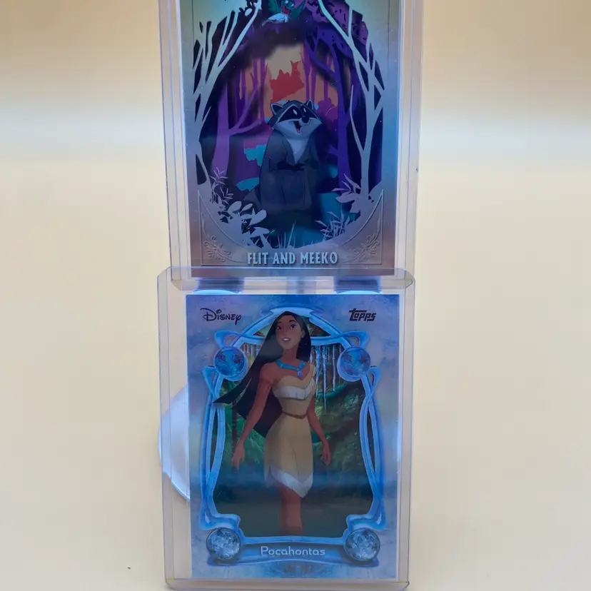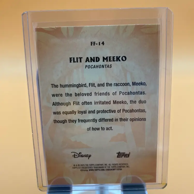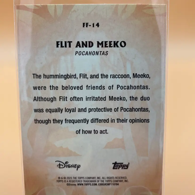 You are purchasing a pair of Pocahontas Trading Cards from the 2025 Topps Disney Wonder line. This listing includes one Gold Foil Furry Friends Insert #FF-14 Flit and Meeko card and one Standard Foil Pocahontas #54 card. These Cards are in overall great condition, see images for a closer look.