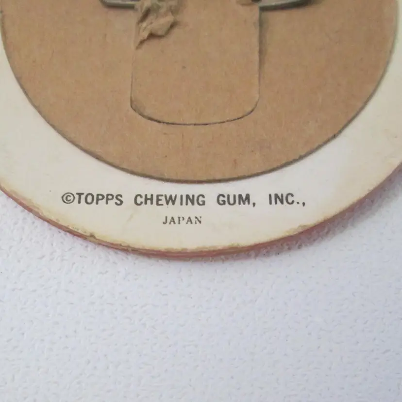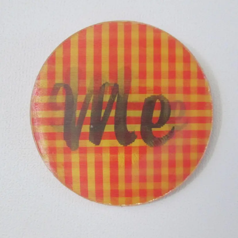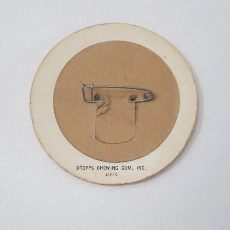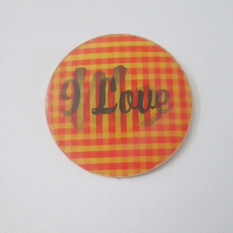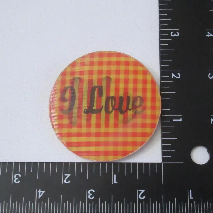 Vintage Topps flicker pin, made in Japan, from the 1960s. Red and Yellow plaid background. Black letters say " I Love Me". Measures 2 1/2" across. One tiny nick in center, otherwise good condition.