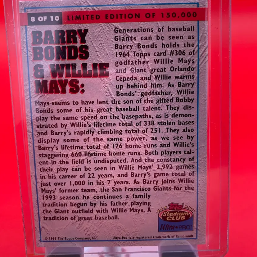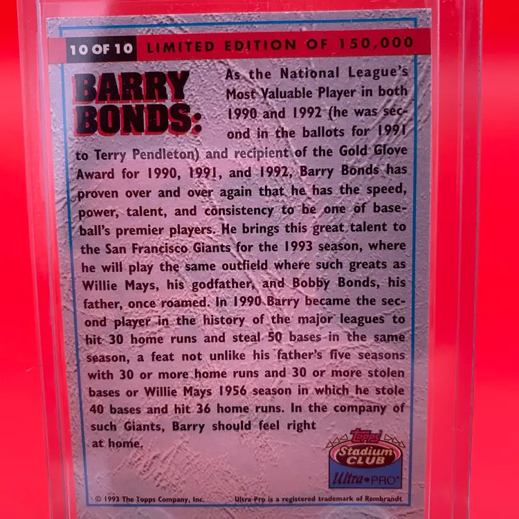 Topps Stadium Club Ultra Pro 1993 Pair of Barry Bonds Trading Cards - #'s 8 & 10