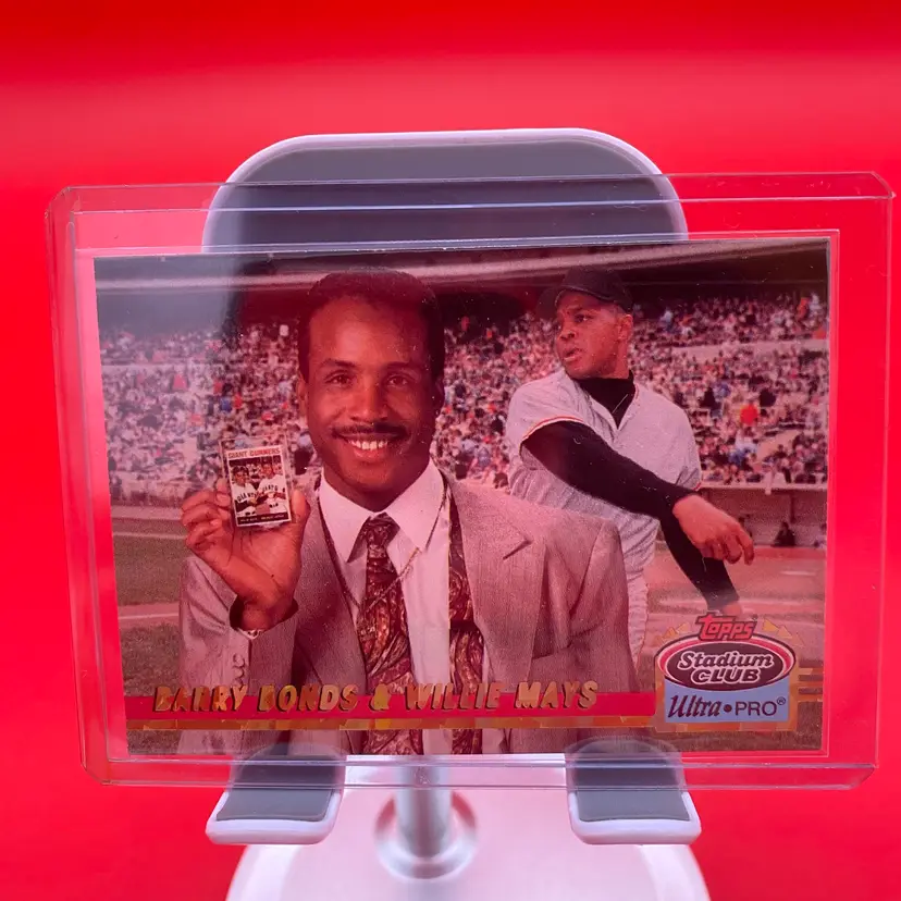 You are purchasing a pair of MLB Barry Bonds Insert Trading Cards from the Limited Edition 1993 Topps Stadium Club Ultra Pro line. This Listing includes one Barry Bonds & Willie Mays #8 and one Barry Bonds #10. These Cards are in overall decent condition, see images for closer looks, see final image for creasing on one of the cards.