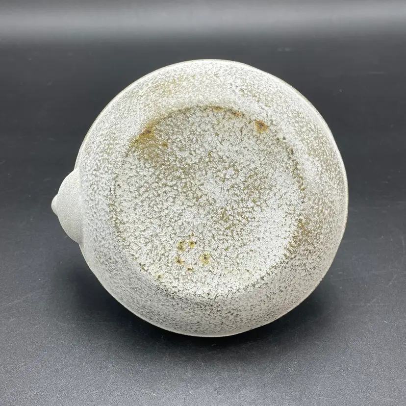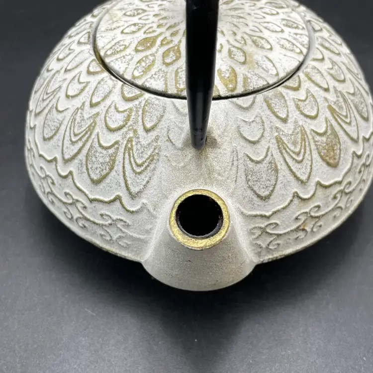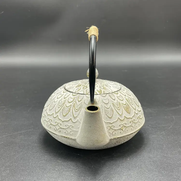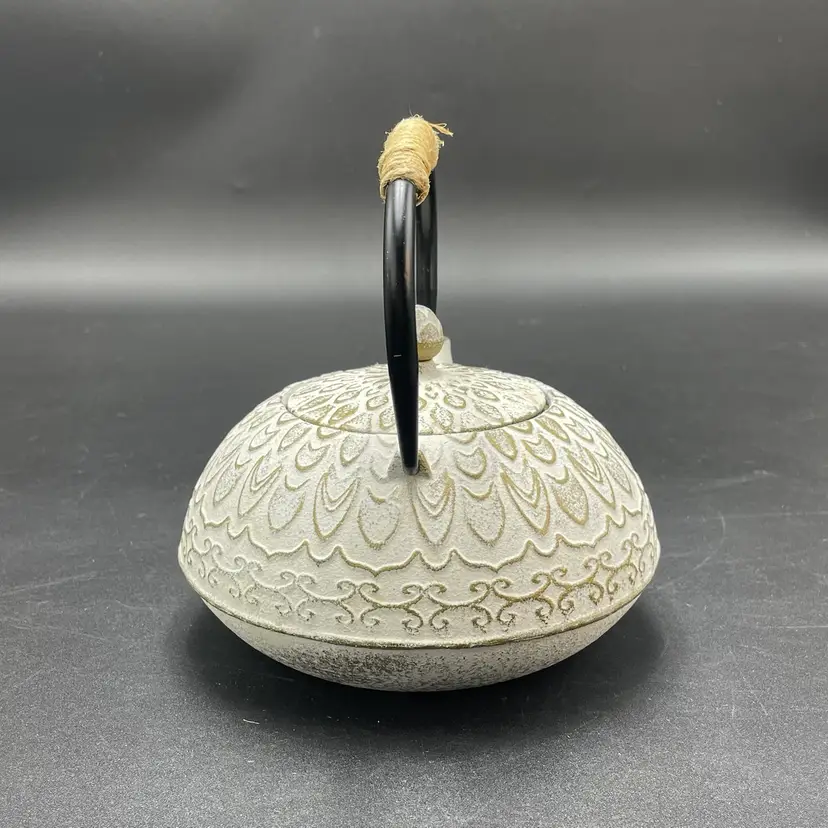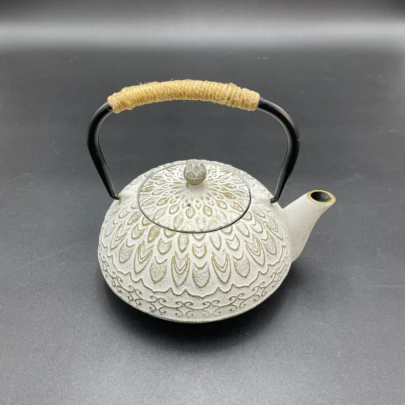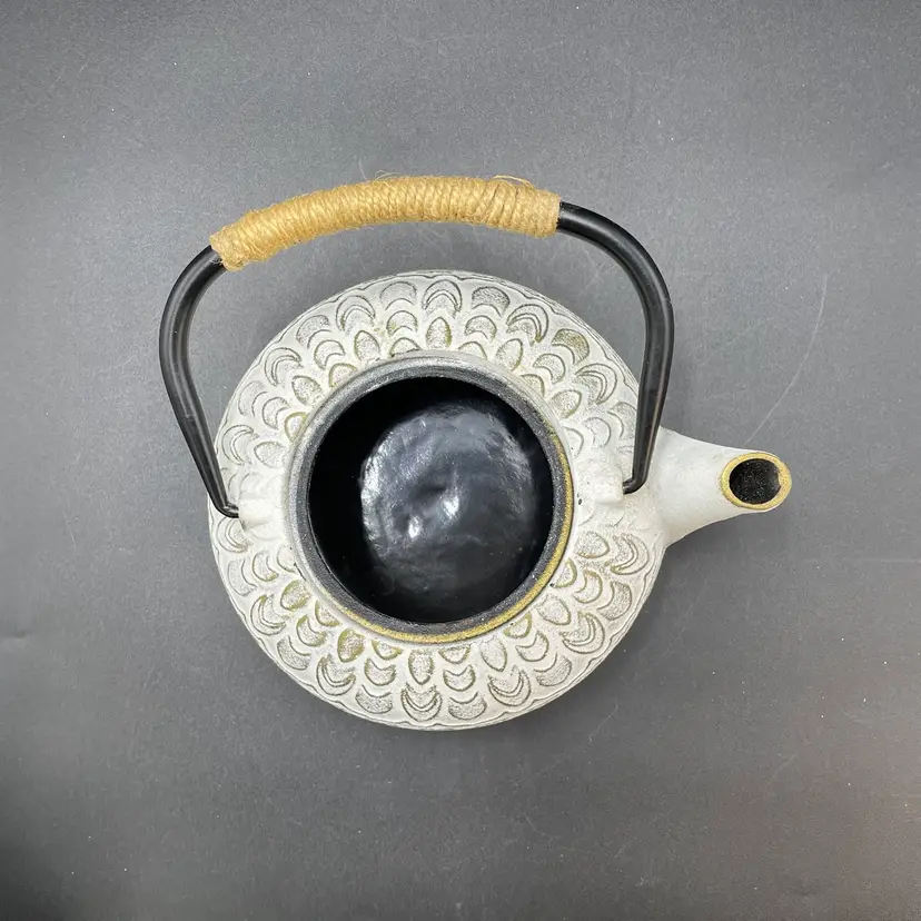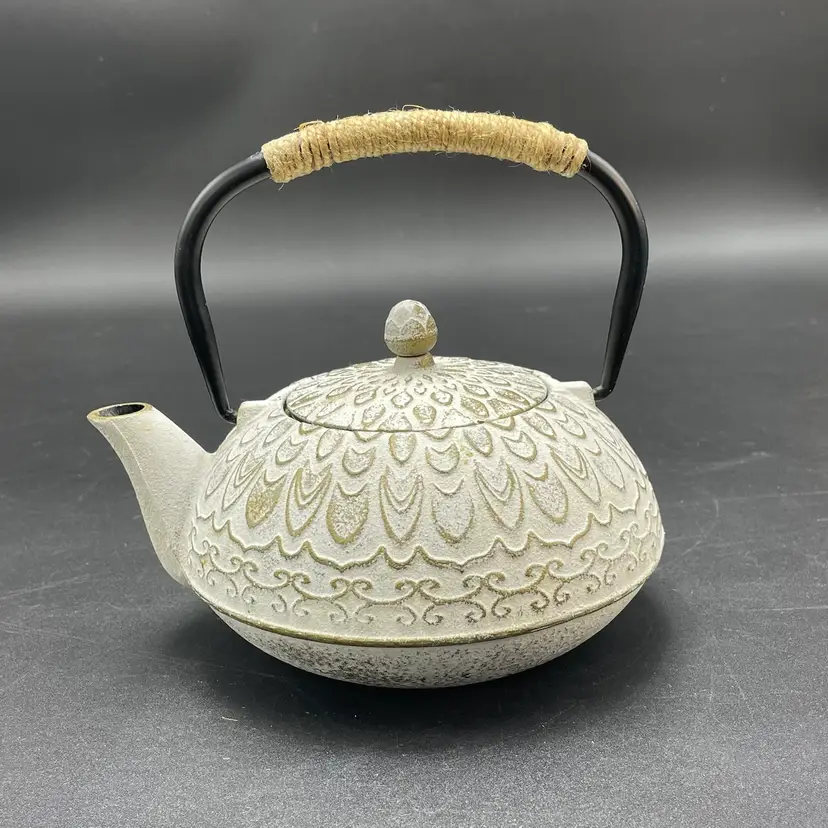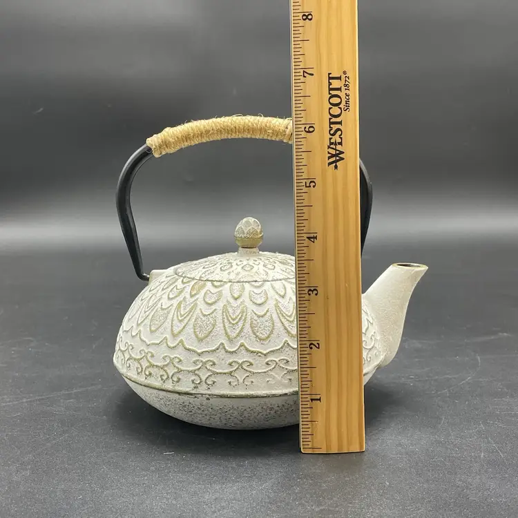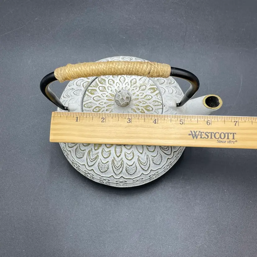 This is a Toptier white cast iron Japanese style teapot with a stainless steel infuser insert. Measures approximately 6" tall including handle x 6" across including spout and holds approximately 34fl oz. No major flaws