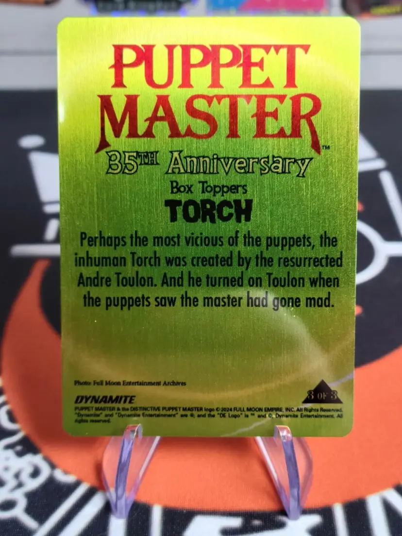 Up for grabs is the highly collectible Torch Metal Box Topper from the Puppet Master 35th Anniversary series. This is the Full Moon / Dynamite version, numbered 3 of 3, making it a rare addition for any Puppet Master or horror memorabilia collection. Crafted with detailed metal construction, this topper is perfect for display alongside your hobby boxes or as a standalone collectible.