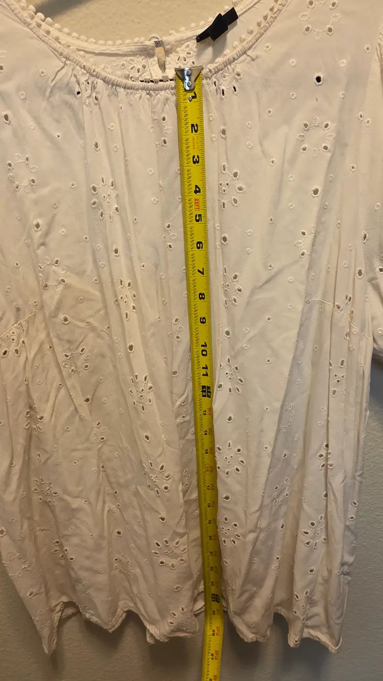 This Torrid Eyelet Blouse Top in Cream Ivory is a stylish and versatile addition to any wardrobe. Featuring puffed sleeves and a round neckline, this blouse is perfect for both casual and business occasions. Made from lightweight and breathable rayon fabric, it offers a relaxed fit that is comfortable for all-day wear. The ivory color and basic style make it easy to pair with a variety of bottoms, while the button accents add a subtle touch of detail. Perfect for the summer and spring seasons, this blouse is a must-have for plus-size women looking for a chic and practical top.