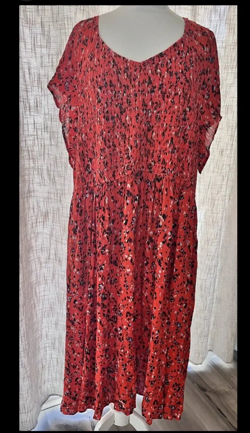 New without tags. Side pockets, 100% rayon dry clean, smocked bodice beautiful Fall colors, but more like year round dress. Measurements are given in photos.