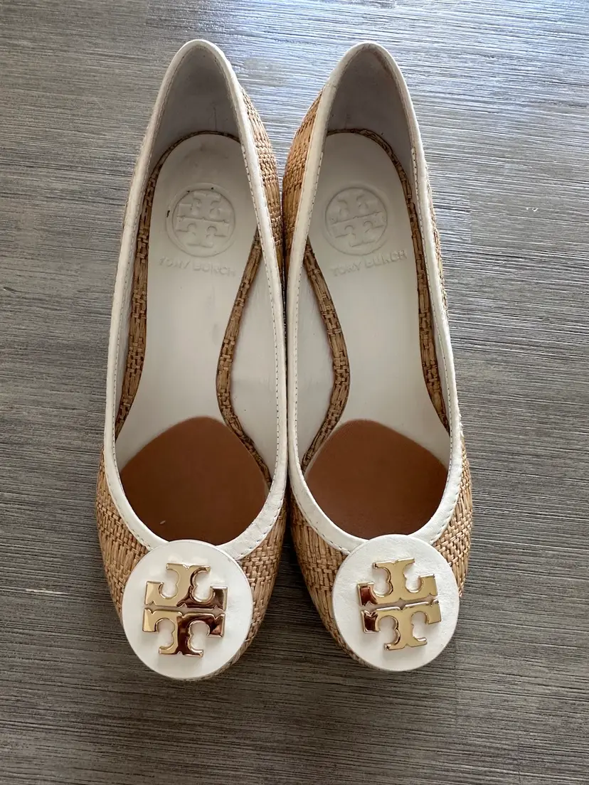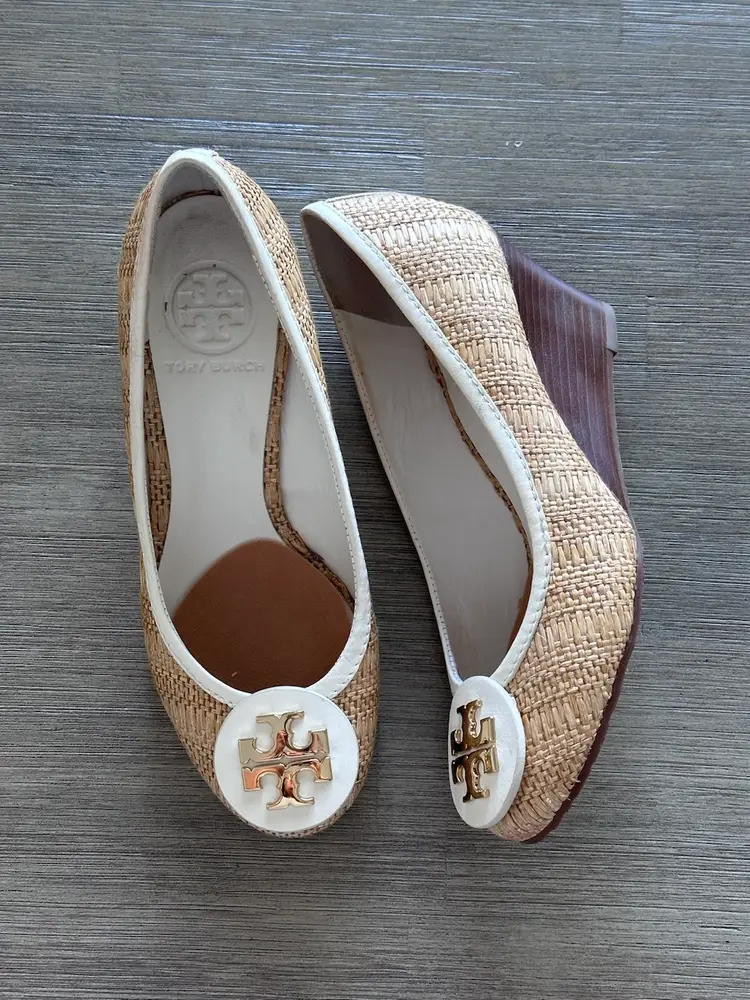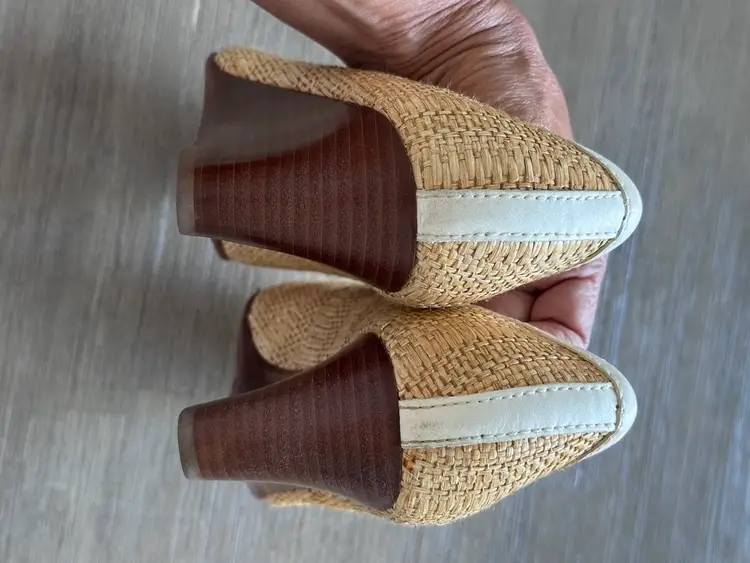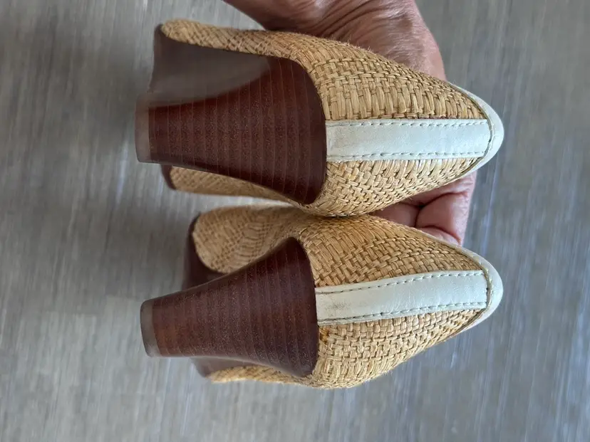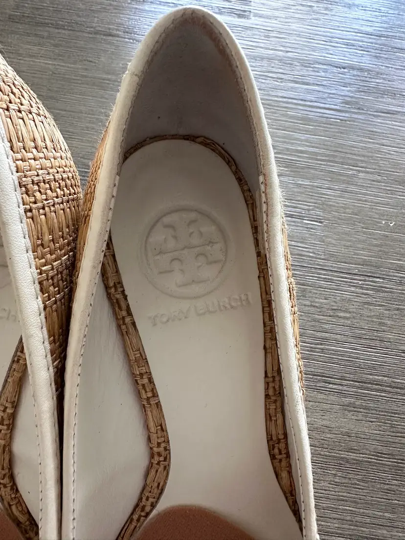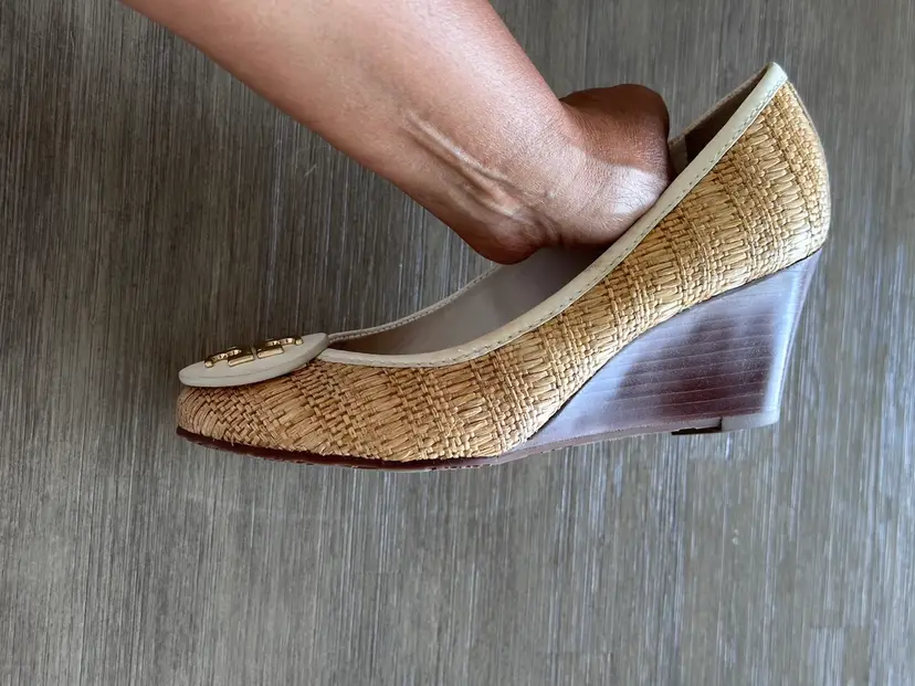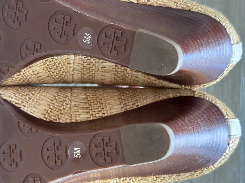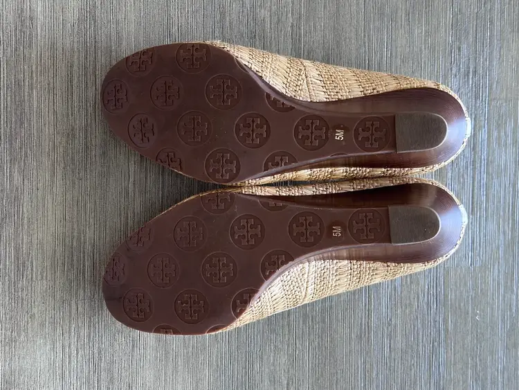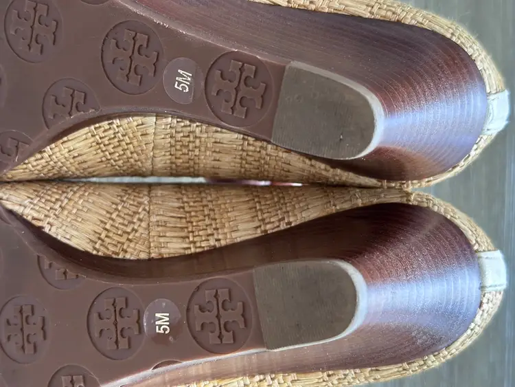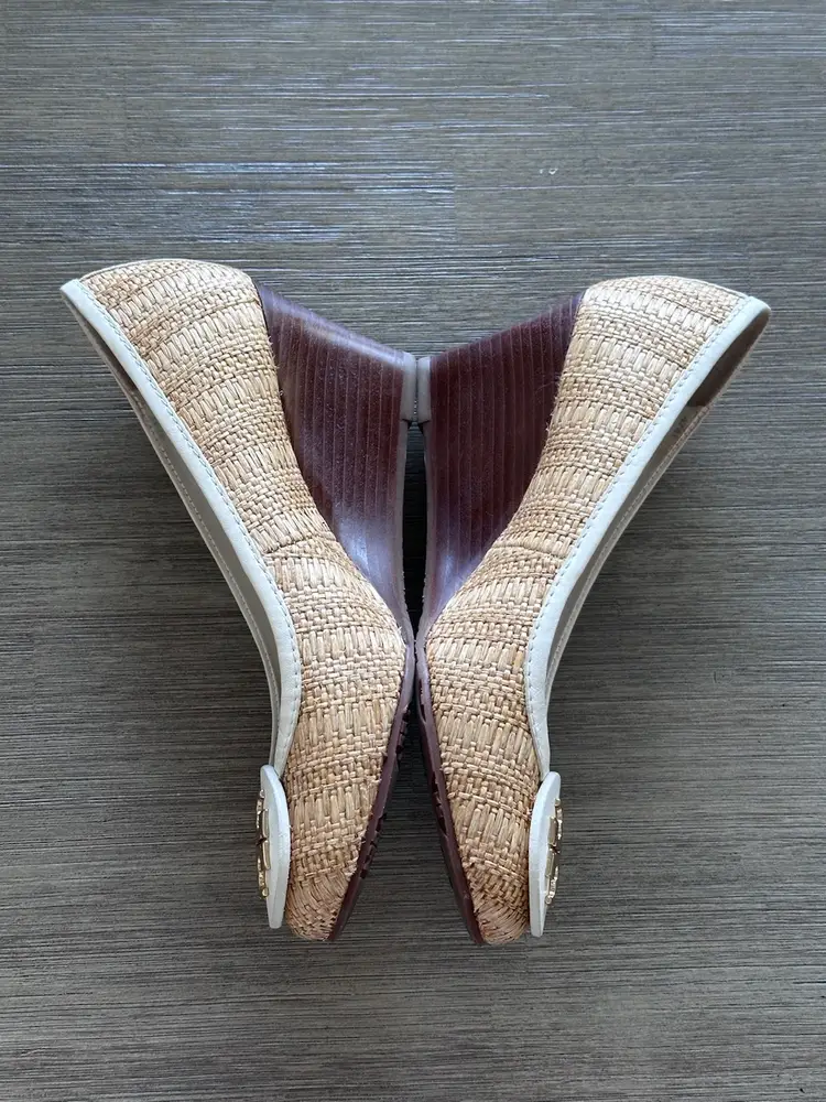 Tory Burch Sally raffia and leather wooden wedges pumps size 5 in Excellent pre loved condition