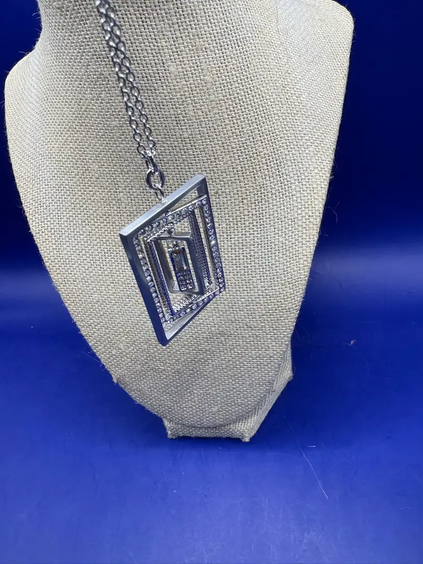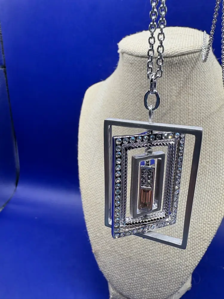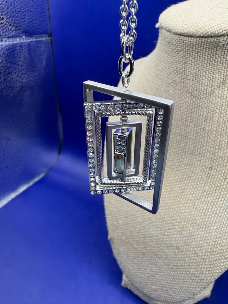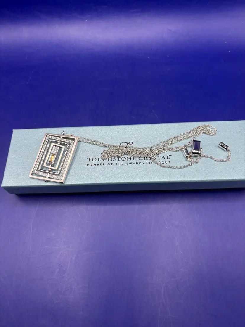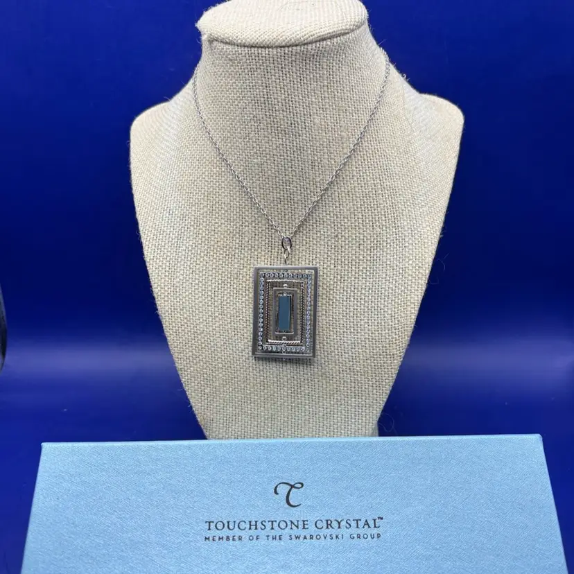 Touchstone Crystal Ask Around pendant with adjustable chain Rectangular pendant with multiple inner rectangle that can spin Closure is adjustable slide Pendant measures 1 1/2 inches by 1 inches Necklace is 32 inches long Swarovski crystals and plated matte rhodium Crystals are Crystal Golden Shadows Crystal Moonlight Crystal Silver Shade