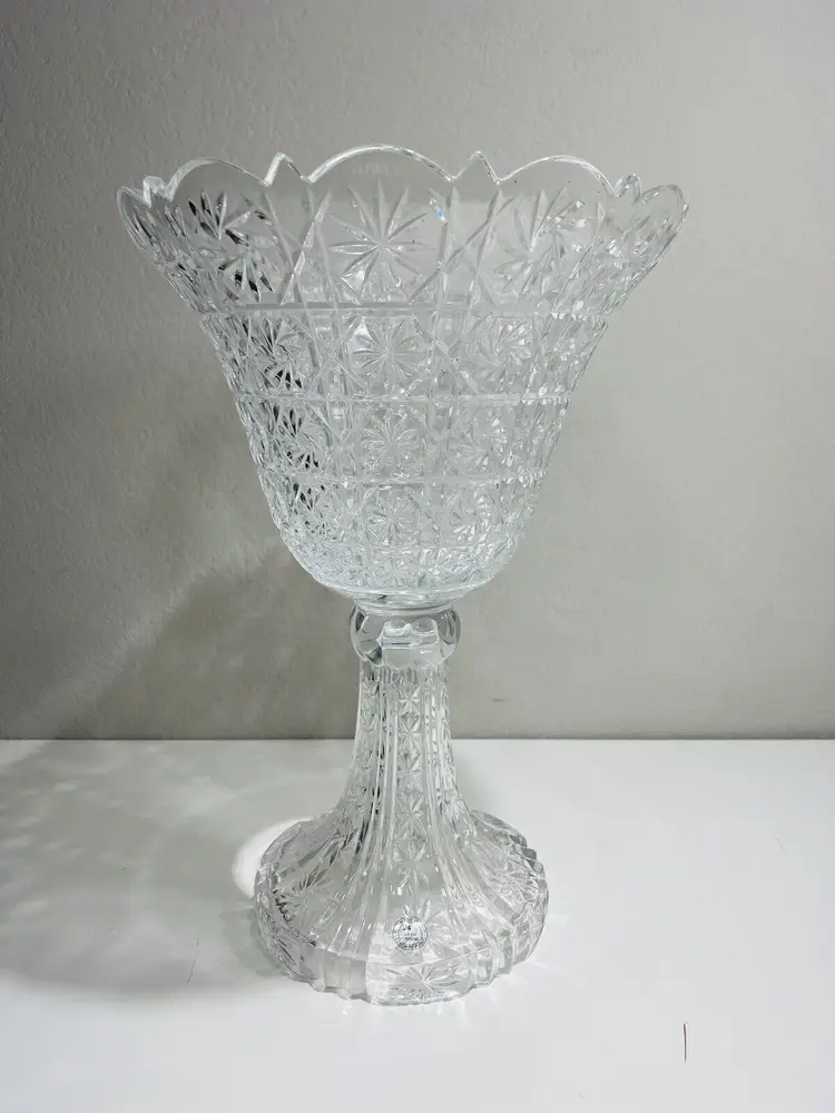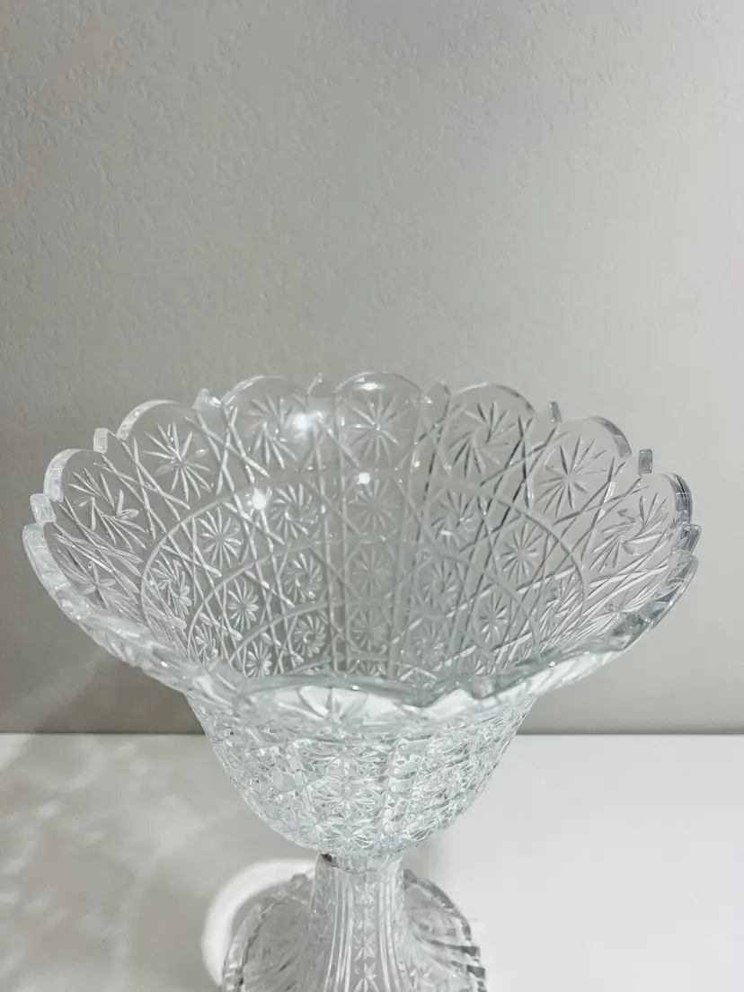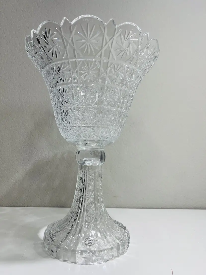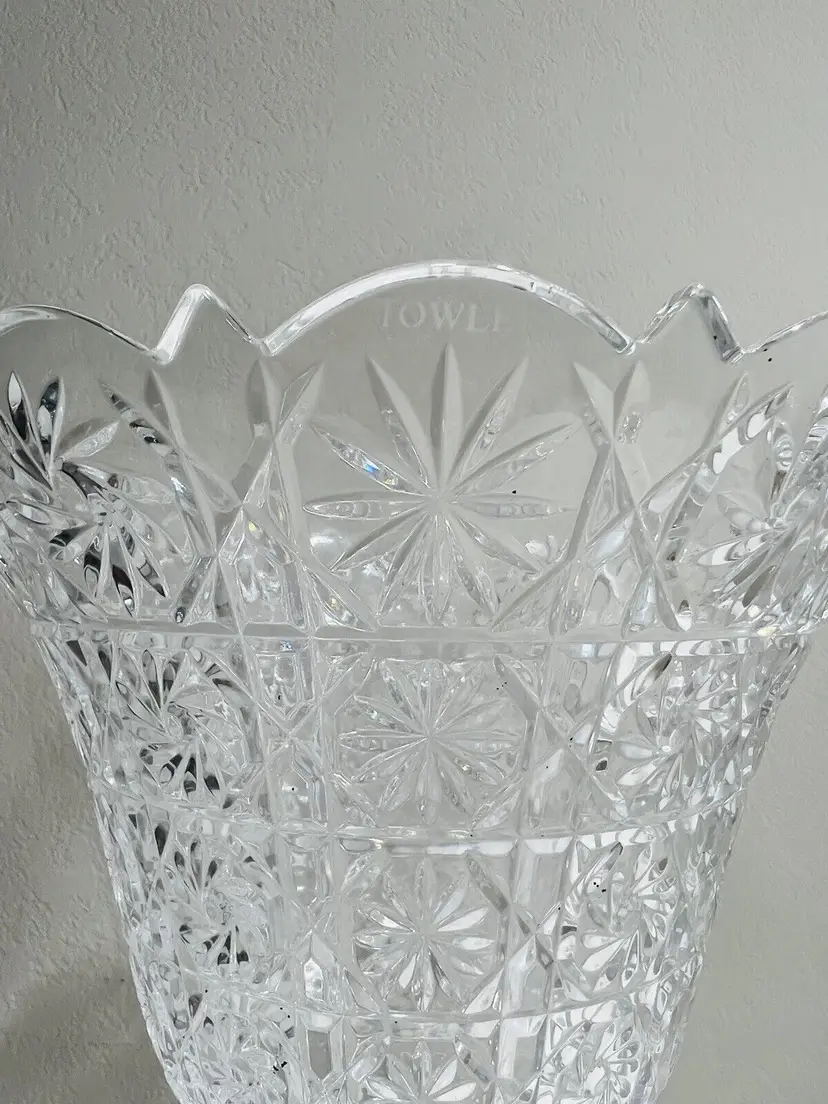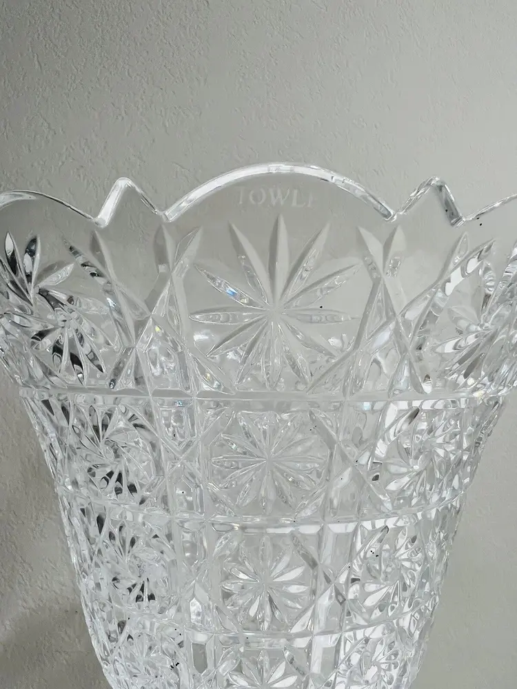 Item Width: 10 in Item Length: 14 in Item Height: 14 in Country/Region of Manufacture: United States Material: Crystal Glassmaking Technique: pressed glass Featured Refinements: Crystal Bowl Type of Glass: Crystal Item Weight: 5 lb Brand: Towle Style: Art Nouveau Color: Clear Signed: Yes Original/Licensed Reproduction: Original Room: Any Room Backstamp: Incised Theme: English Type: Centerpiece Bowl Original/Reproduction: Vintage Original