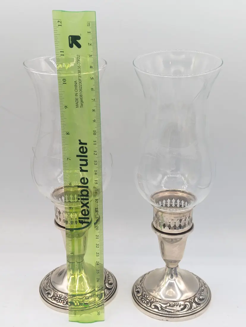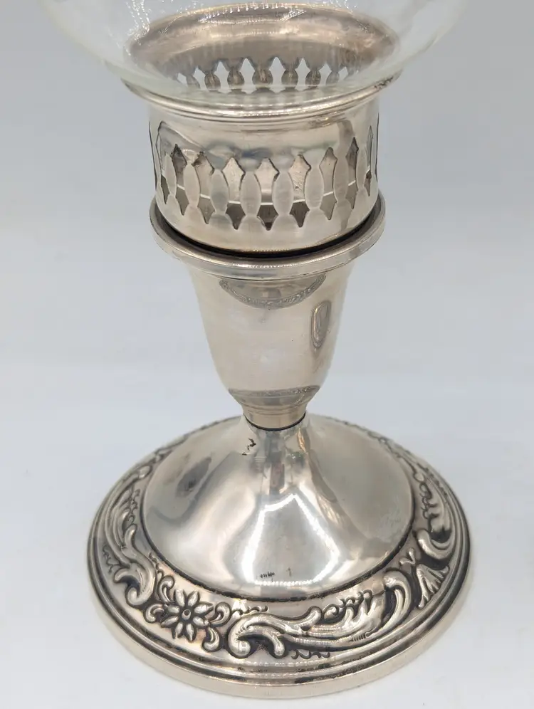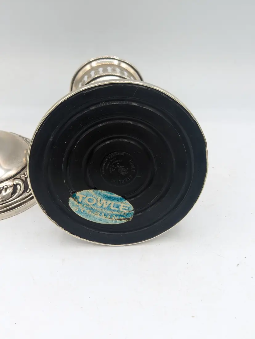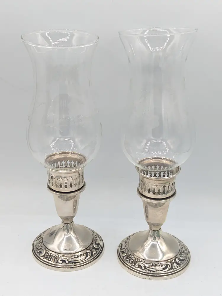 For your consideration is a beautiful pair of Towle sterling silver weighted candle sticks with etched globes. Beautiful floral detailing along base of the candlesticks. Much more detailed than the usual sterling silver candlestick base.