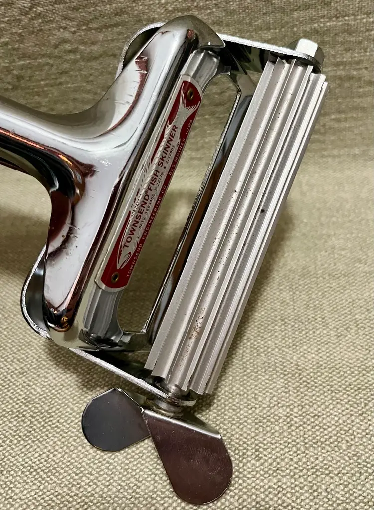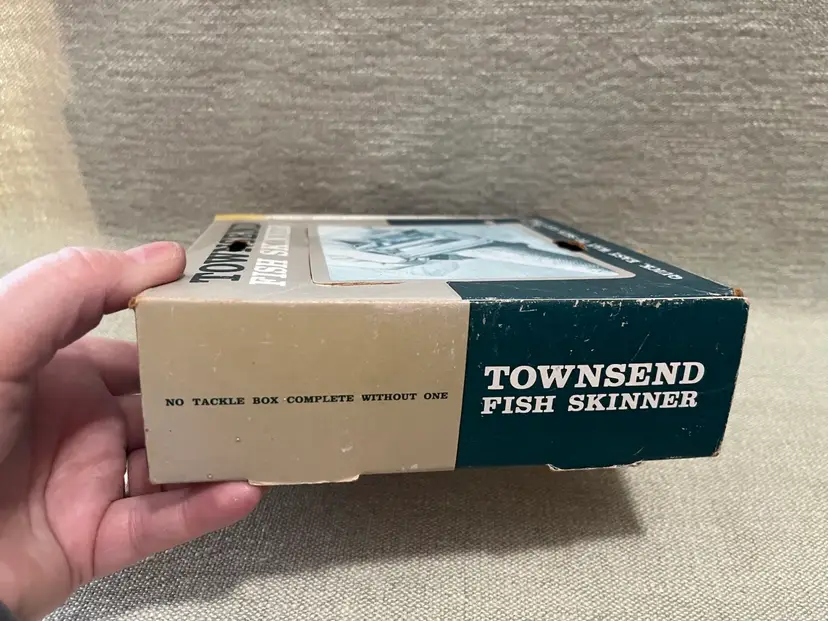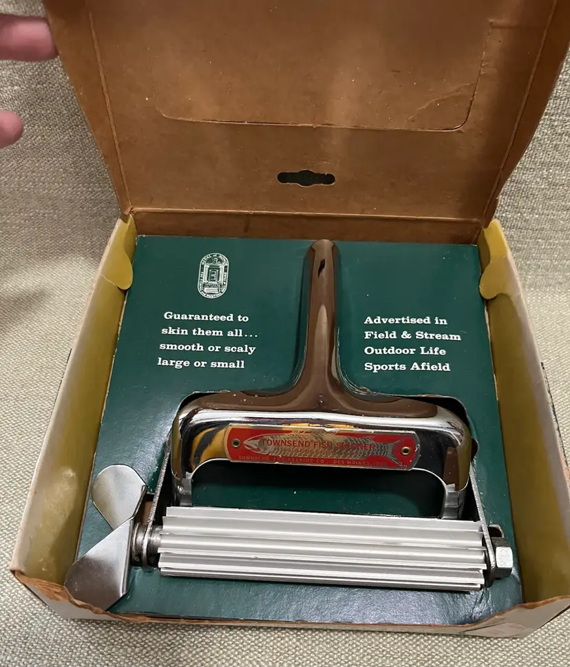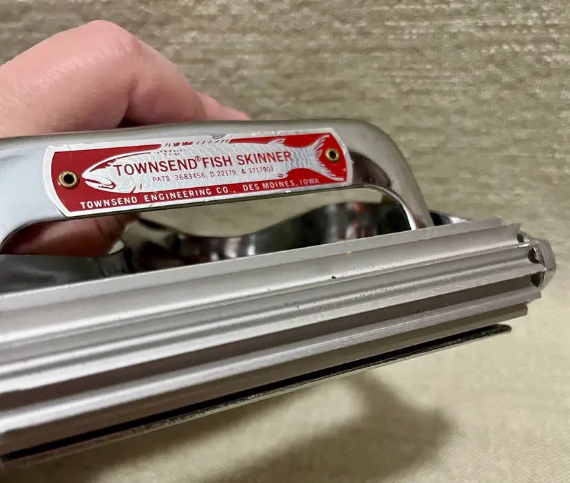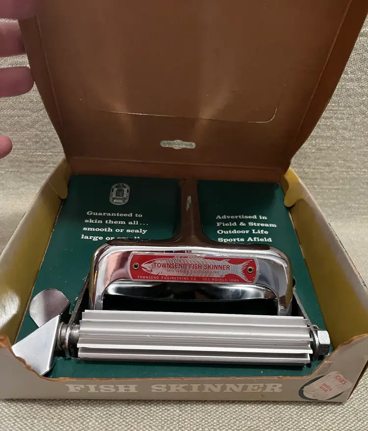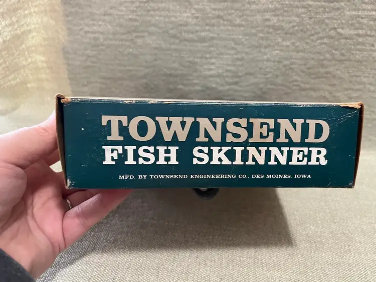 The Townsend Engineering Co. Fish Skinner Metal Skinning Tool is a vintage fishing accessory designed for both salt and fresh water use. Made in Des Moines, Iowa, USA, this tool is a practical addition to any fishing gear collection. With its high-quality metal construction and authentic United States materials, this fish skinner is a reliable and durable option for anglers looking to efficiently skin their catches. Included in its original box with black and white photocopy of inner paperwork (a copy-not original).