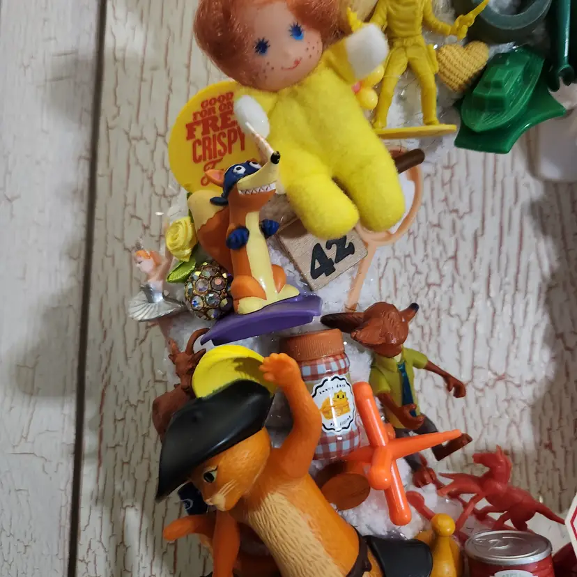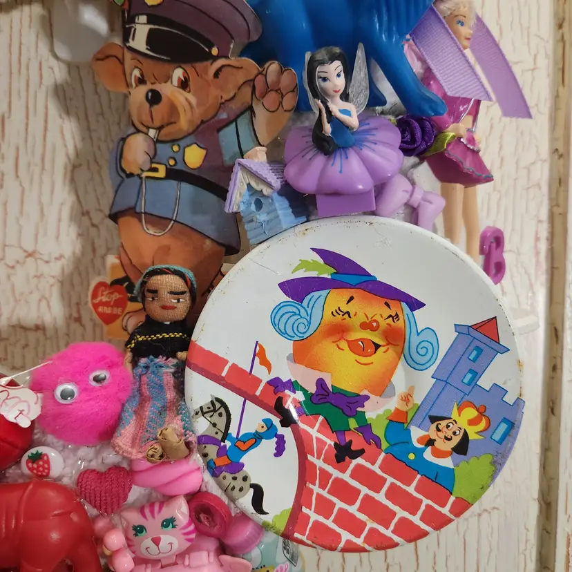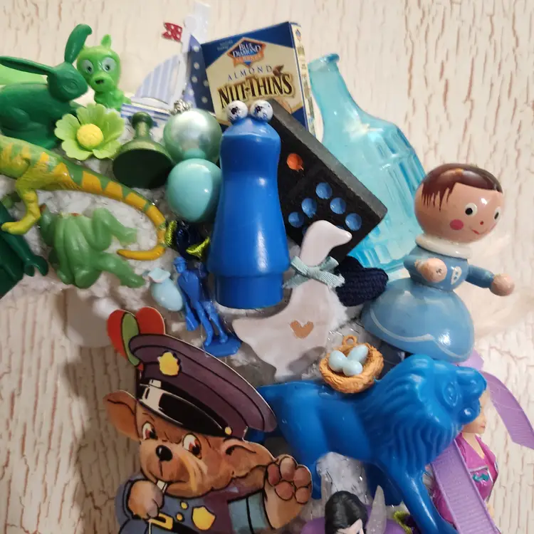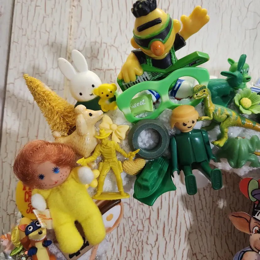 All sorts of toys! Many are vintage, some are newer, but all thrifted or found. This wreath is an "I spy" game at it's most fun. So fun on a wall to satisfy your inner child. The wreath measures 10 plus inches