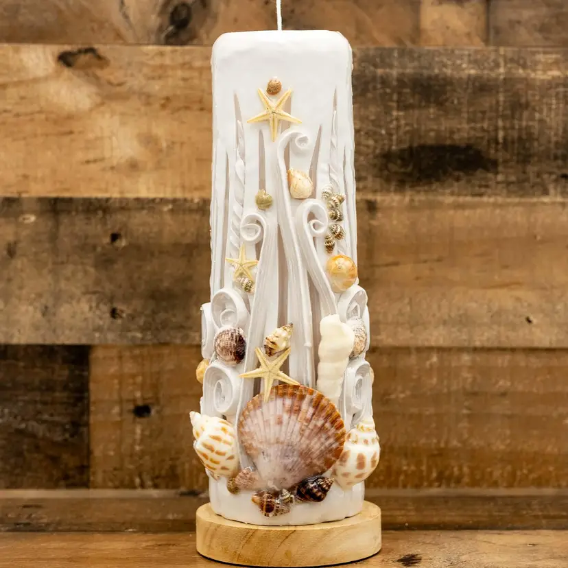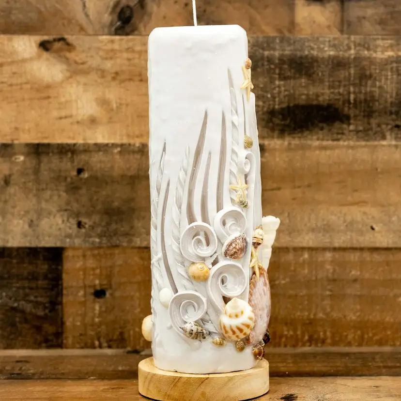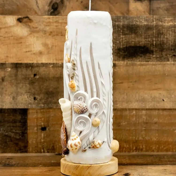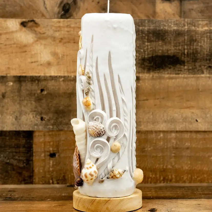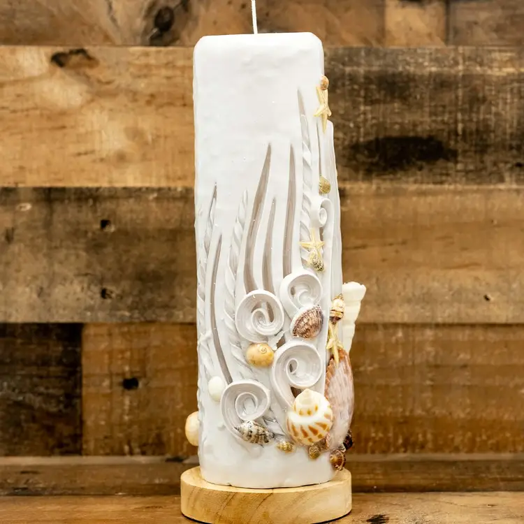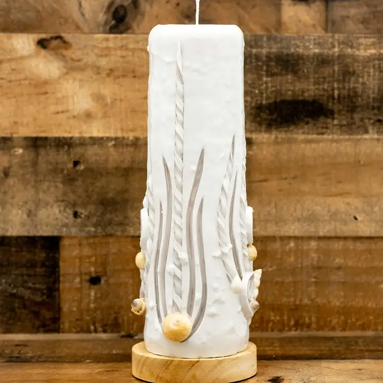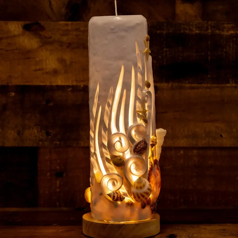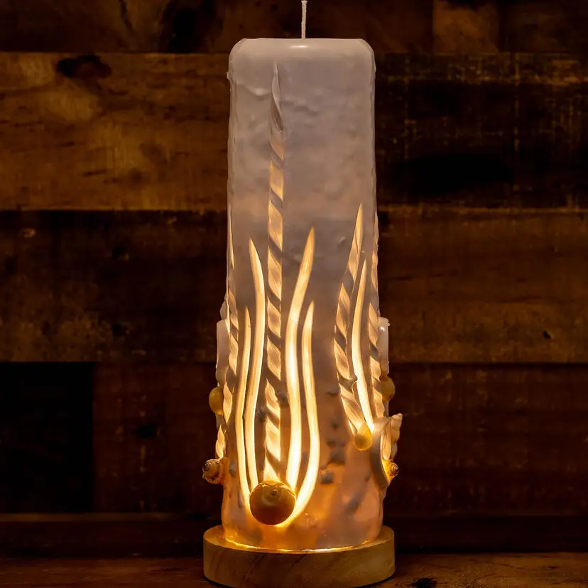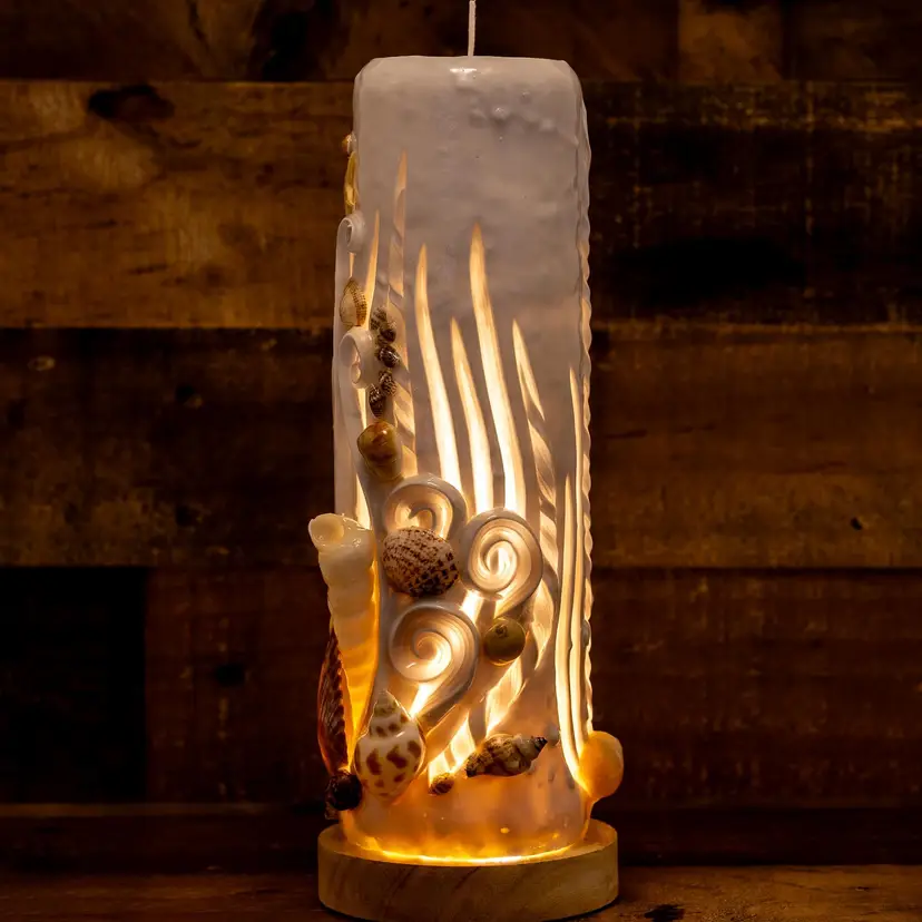 Dimensions: ~3”x3”x9.5” Weight: ~2.25lb. 100% food-grade paraffin wax. 100% cotton wick. Each candle is free-hand carved based on the original design (pictured in this listing) when ordered and no two candles are identical. Light base sold separately. The weight and size listed is approximate and may vary with each piece. Candles glow when burning or placed on a light base. High melt-point wax preserves exterior artwork after use and all candles are refillable with tealights.