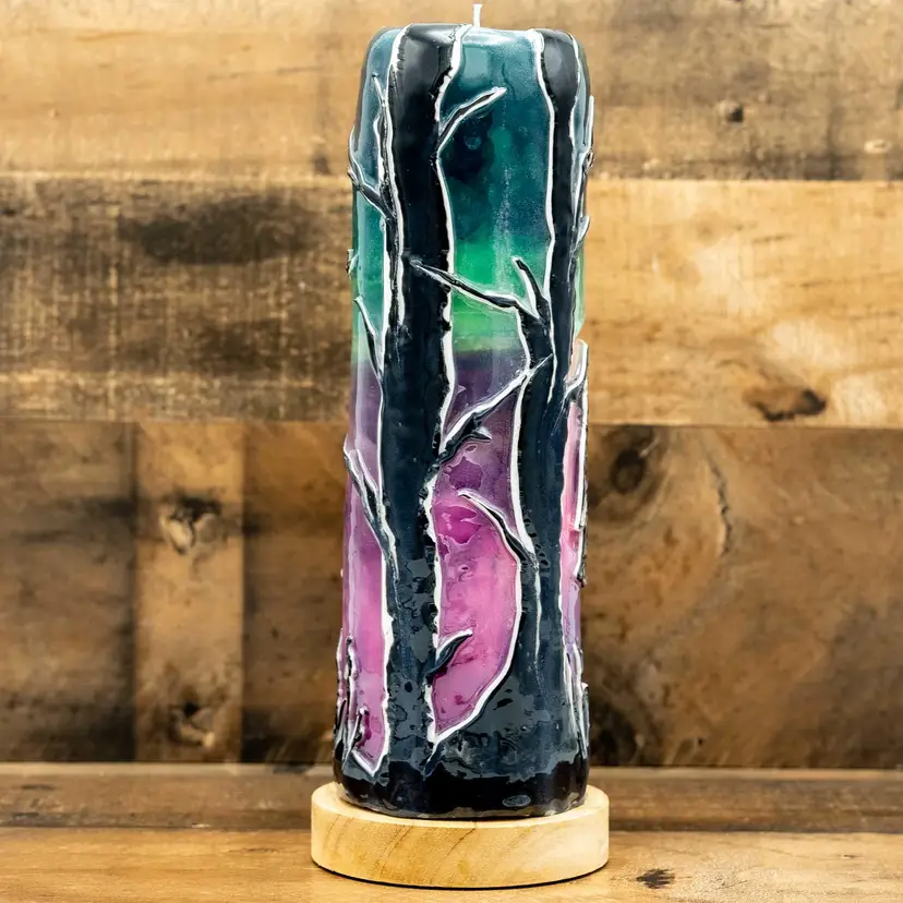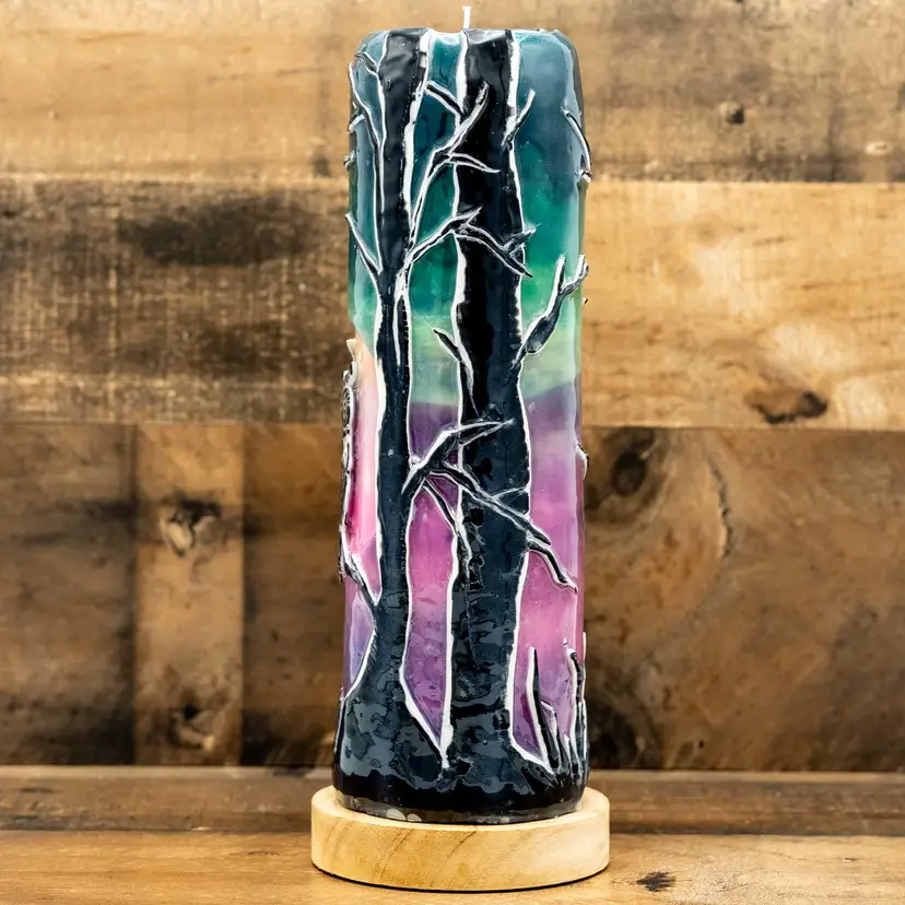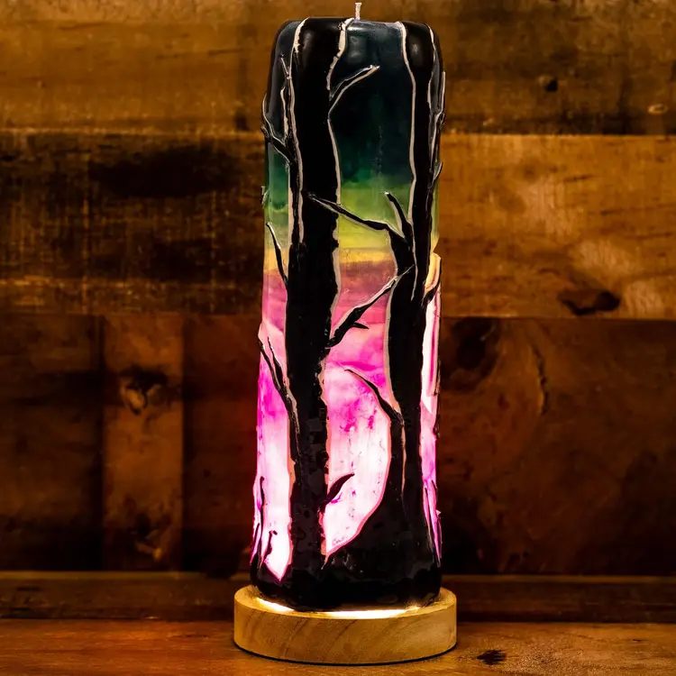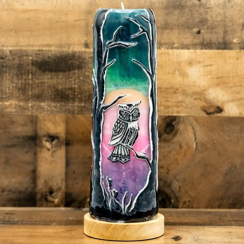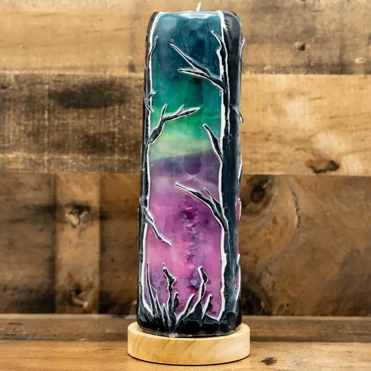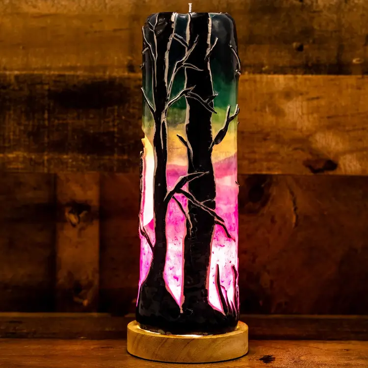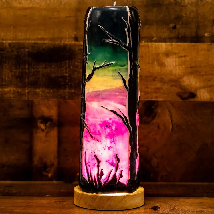 Dimensions: ~3”x3”x9.5” Weight: ~2.25lb. 100% food-grade paraffin wax. 100% cotton wick. Each candle is free-hand carved based on the original design (pictured in this listing) when ordered and no two candles are identical. Light base sold separately. The weight and size listed is approximate and may vary with each piece. Candles glow when burning or placed on a light base. High melt-point wax preserves exterior artwork after use and all candles are refillable with tealights.