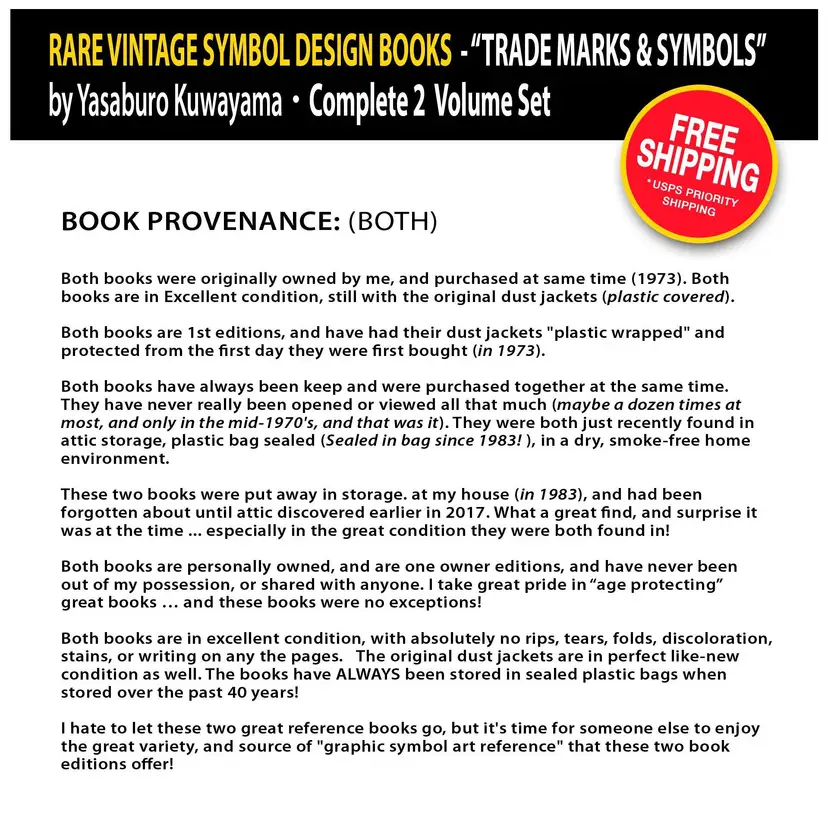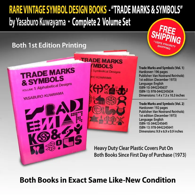 • In the fact that Kuwayama’s "Trademarks & Symbols" books haven’t been reprinted since they were originally published in 1973 ... it's often a little bit tricky to find these books in excellent good quality, or that haven't been OVERLY used, poorly stored, cut-up, or that show damage, due to their age, or use!