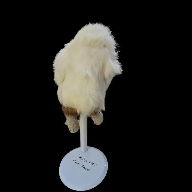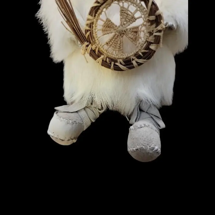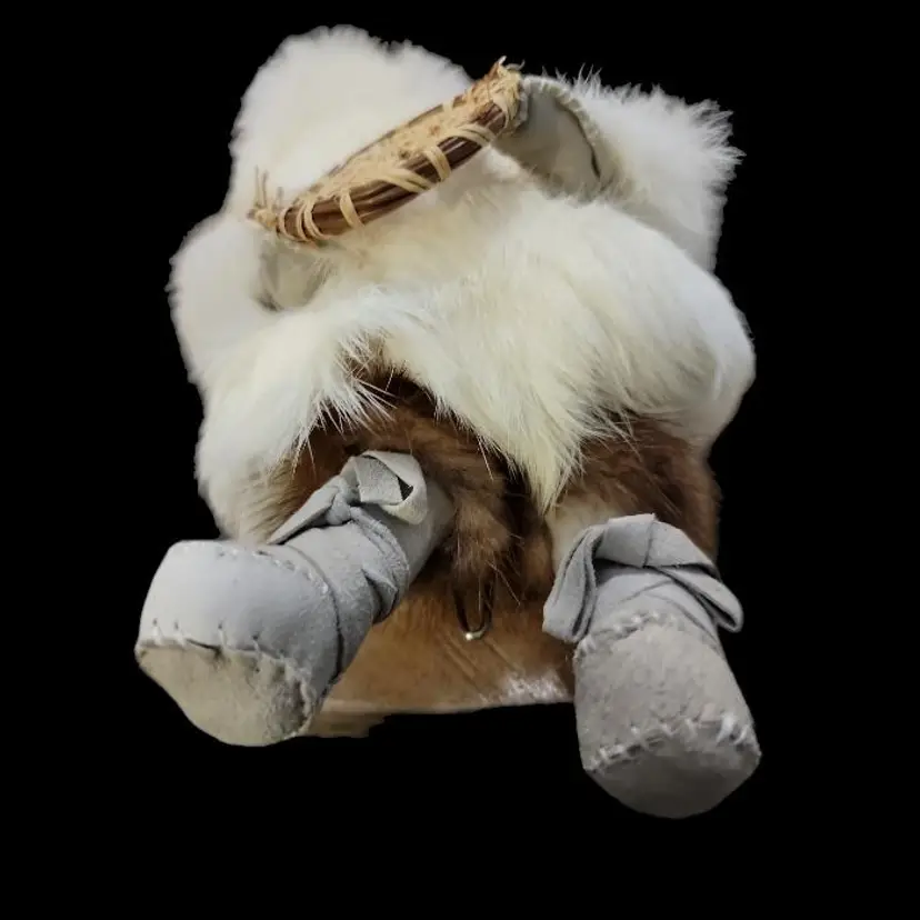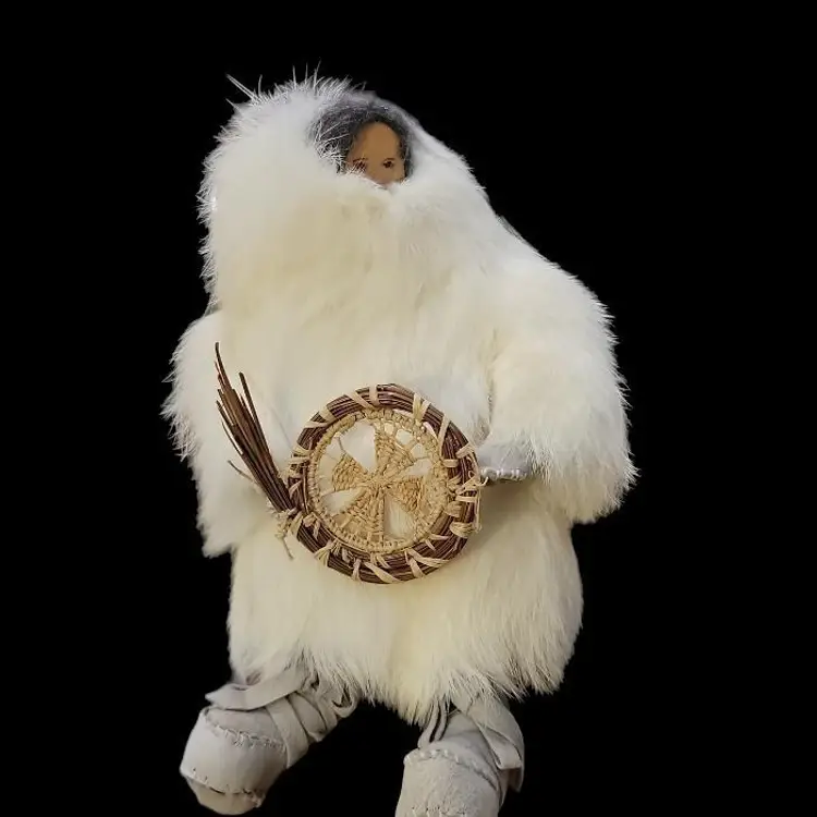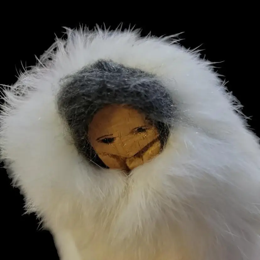 This is a northwestern north American Inuit representative depicted with natural fur a wooden hand carved face and woven straw shield. Eskimo is not a term used with respect for the indigenous people so I have refrained from using it here. His boots are trimmed with real fur (sorry I am not big on fur so I can't identify the animal) and leather suede hand made boots. He comes with a stand which has a part inside thatbis sewn to the figure, although I think it could be cut with scissors if you wanted to remove this stand. The inside is marked with a B, which may or may not be the artist's mark.off the stand he is about 10" tall and about 6 1/2" at the widest point. On the stand, he is 12" high.