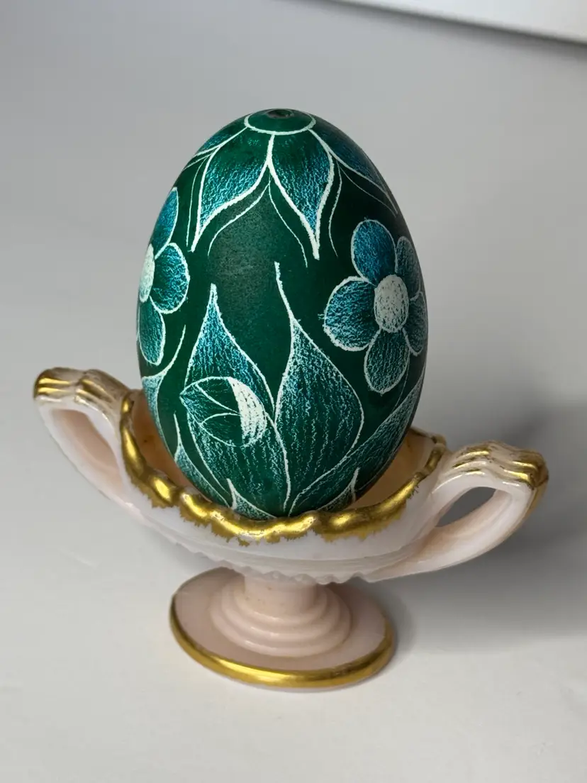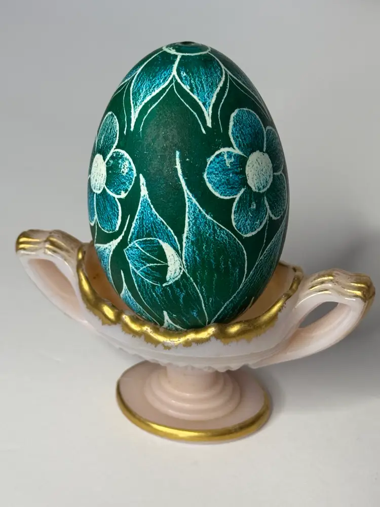 Not only is this real quail egg hand painted with a Ukrainian Pysanka technique using wax and die, a needle is used to create additional design and contrast. The egg is in very good condition and measures 3 3/4” x 2 1/2”.