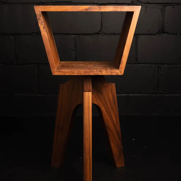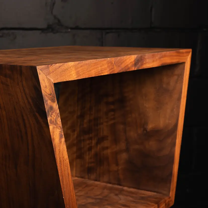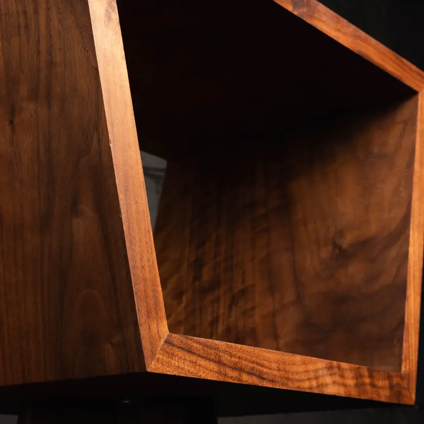 Crafted from solid walnut, this sculptural piece celebrates the natural beauty of the material through a continuous waterfall grain that wraps seamlessly around the entire form. The grain flows uninterrupted across each surface, creating a sense of movement and cohesion that emphasizes the integrity of the design.