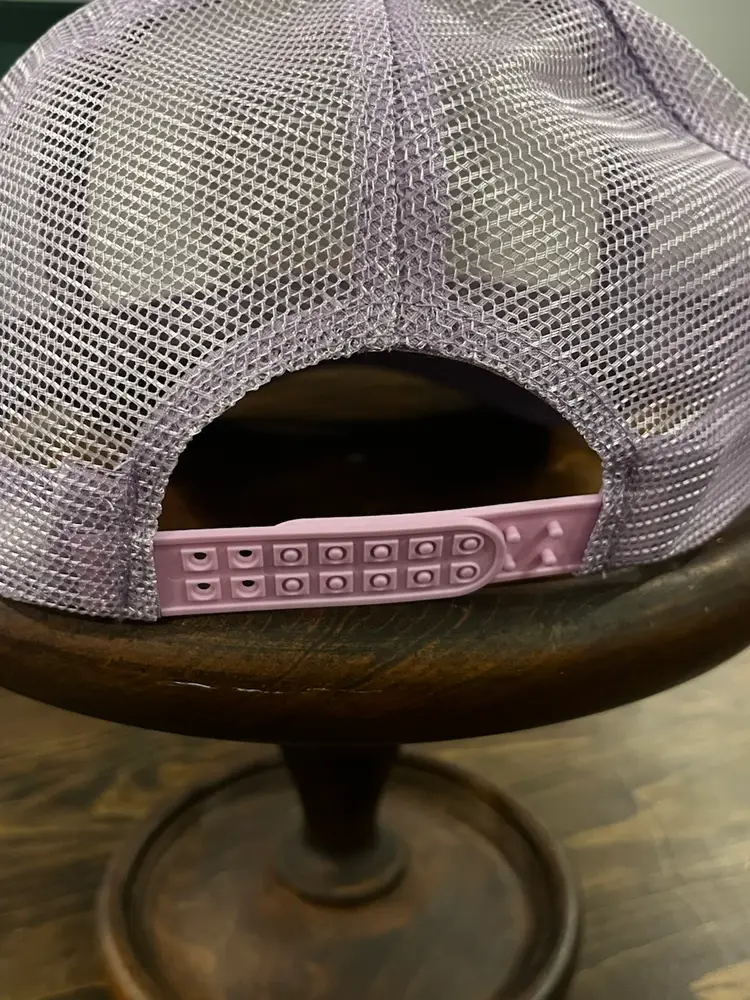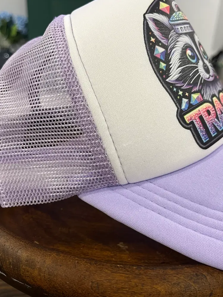 Adorable trashy raccoon design on a light lavender trucker hat!! Unisex style SnapBack adjustable hat! Design is a flat DTF transfer so smooth to the touch! Chain accessories are available as an add on option!! Several available and I will send photos of options (multi gold tone, silver tone and pearl available!) If you want a different colored hat, please message me!!