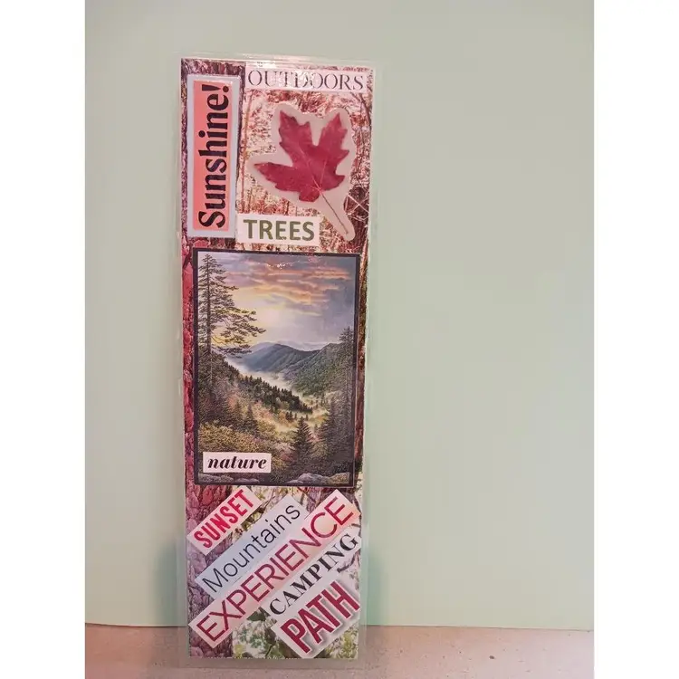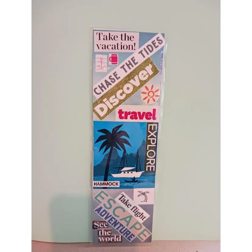 Desired destinations, or places you have been! A great gift for a seasoned traveler. Front and back pictured. All content sourced from old magazines from 1940s to present, and an occasional found sticker. Unique one-of-a-kind art piece. Approximately 8 3/4" x 2 3/4".