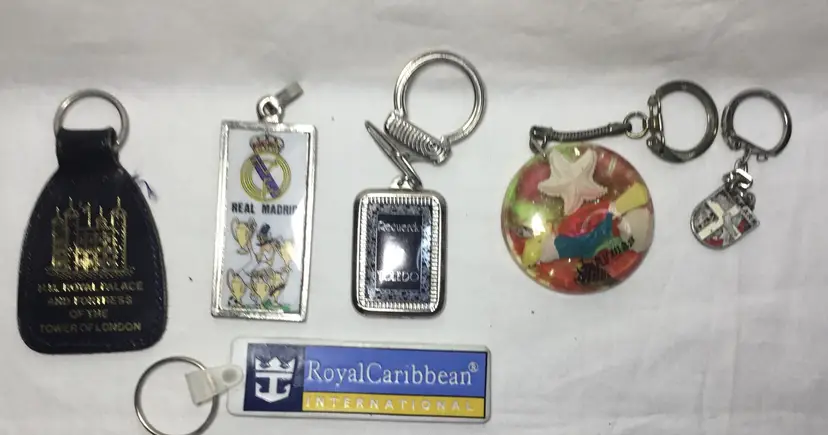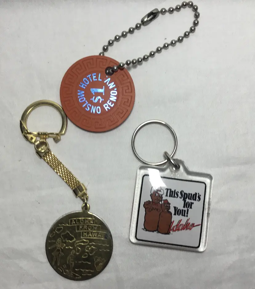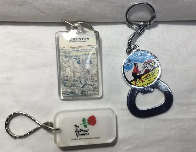 Lot of 12 travel themed key rings. International: Royal Caribbean cruises, Toledo Spain, Denmark, Key rings, Guaymas Mexico, London, Madrid. 3 from U.S. states, Idaho, Reno Nevada, Hawaii. 3 from Canada: Edmonton, Buchart Gardens (Victoria, B.C.) 3 Valley Gap, B.C.
