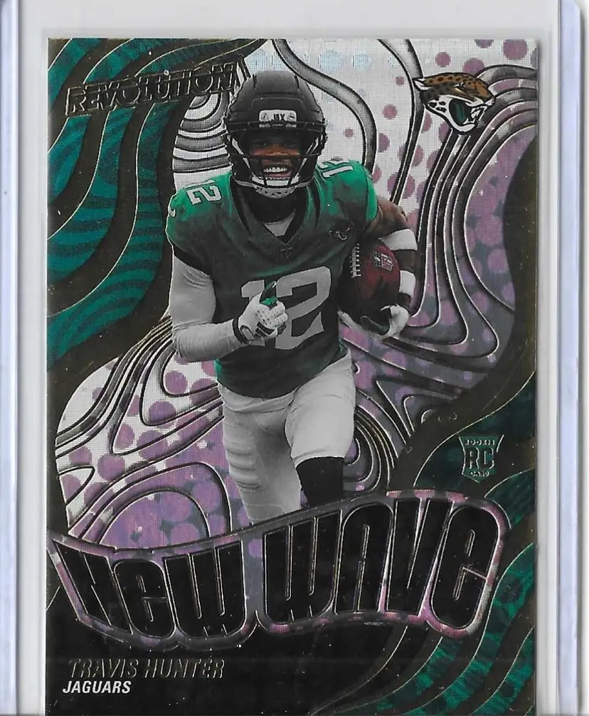 Snag this eye-catching Travis Hunter rookie card from the New Wave series. Perfect for any Jaguars fan or card collector looking to add some flair to their collection.