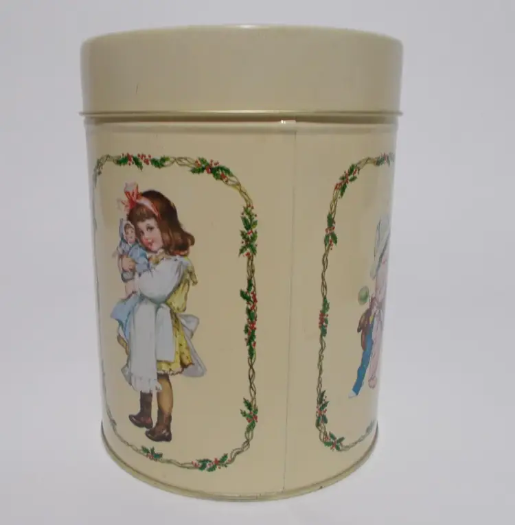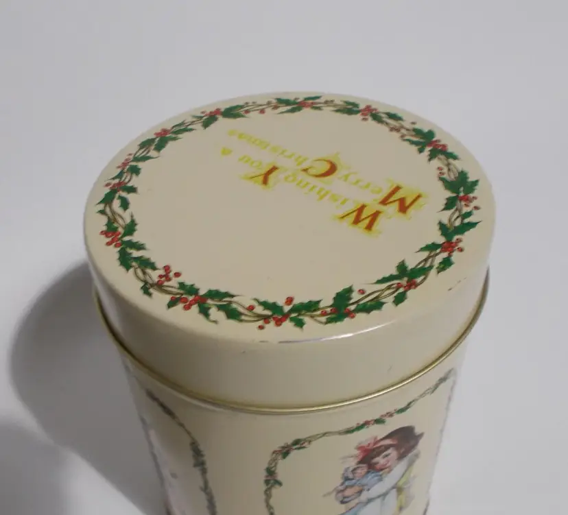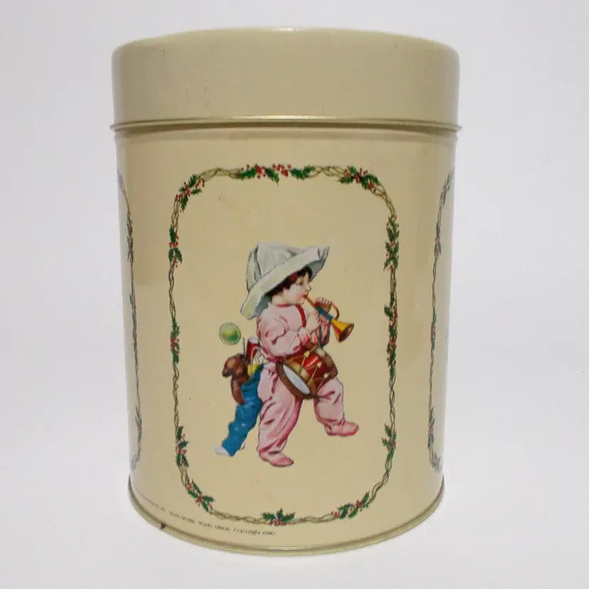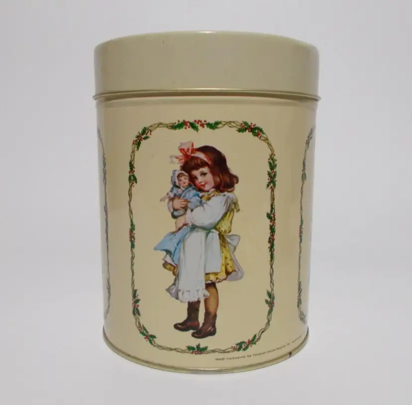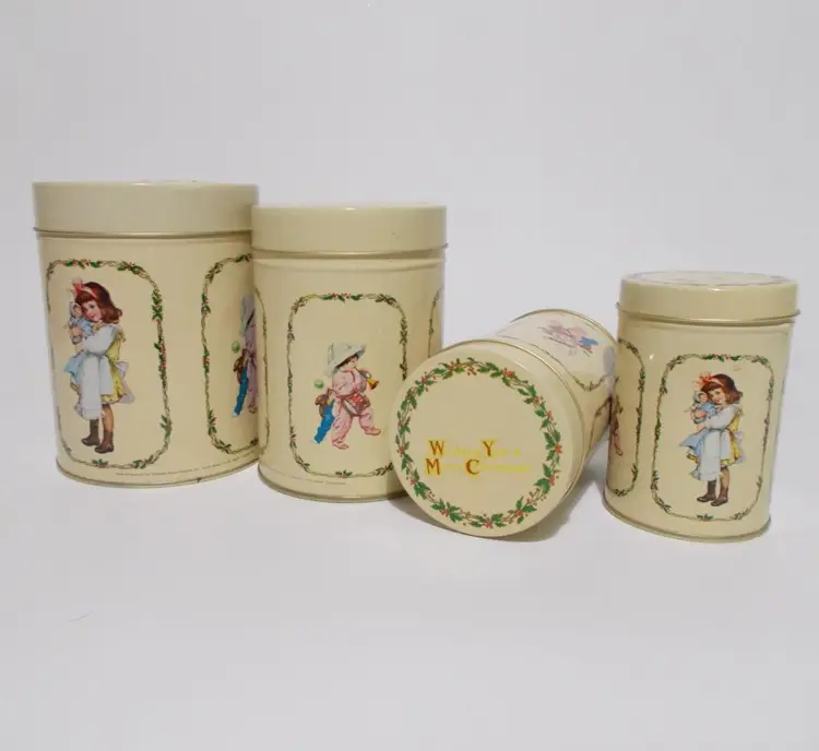 Set of four Treasure House Christmas nesting canister tins. Lids say " Wishing you a Merry Christmas". Sides have childhood scenes of a girl with a doll and a boy with a drum. Sizes range from 4" to 5 1/2" tall, and 2 1/2" across to 4" across. Minor wear on edge of largest lid.