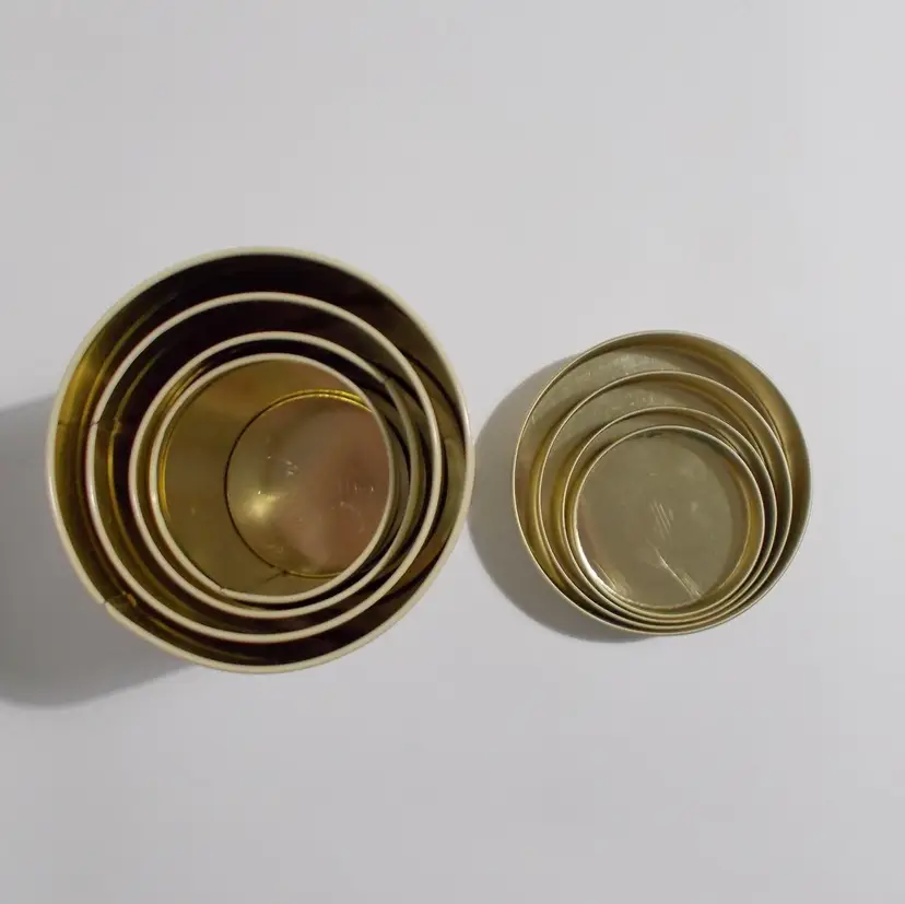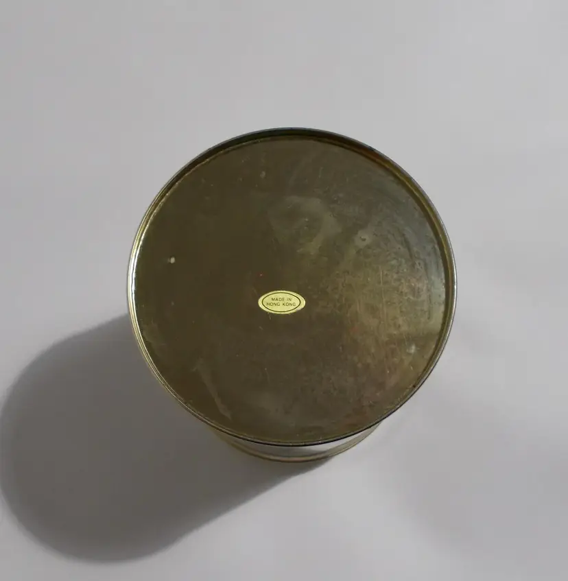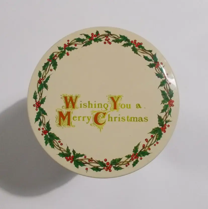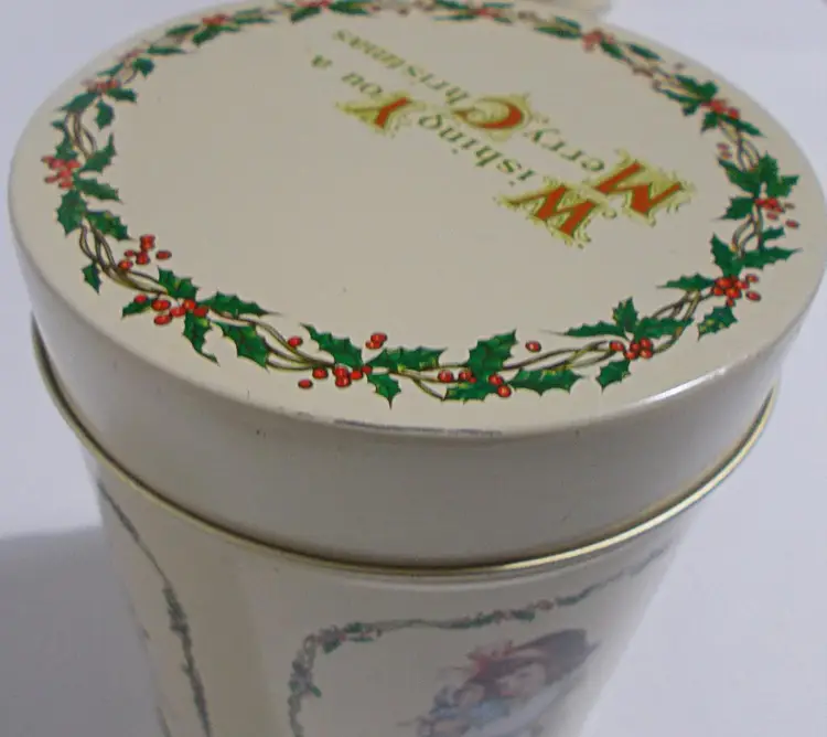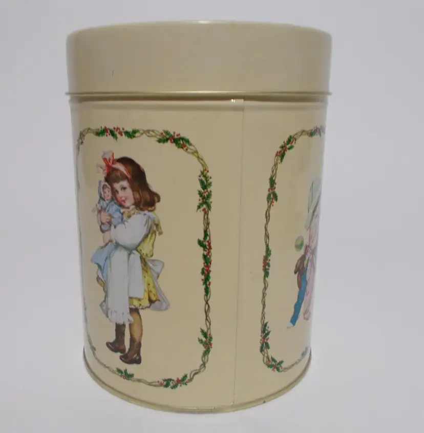 Set of four Treasure House Christmas nesting canister tins. Lids say " Wishing you a Merry Christmas". Sides have childhood scenes of a girl with a doll and a boy with a drum. Sizes range from 4" to 5 1/2" tall, and 2 1/2" across to 4" across. Minor wear on edge of largest lid.