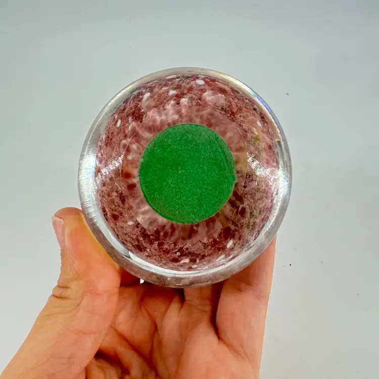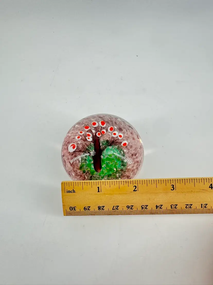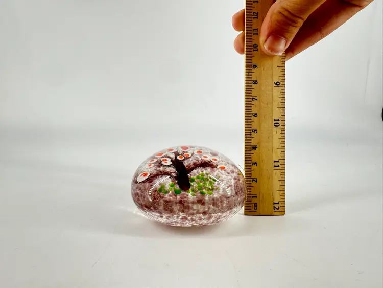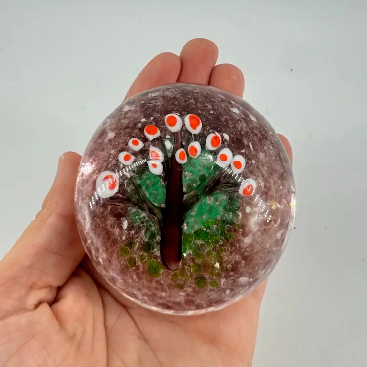 This paperweight features a tree with many orange and white blossoms on it, but let’s just say they’re eyes. It has a light purple speckled background. There are no chips, cracks, or signatures. It measures approximately 2.25” across and 4 cm tall.