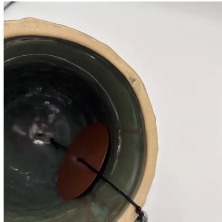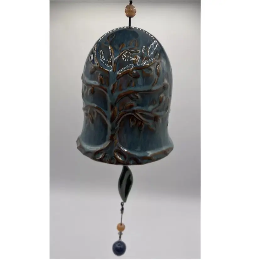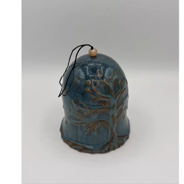 Lovely tree of life, bell shaped ceramic wind chime. Bell itself is about 5 1/4” tall. No chips or cracks. One small flaw in glaze on bottom rim of bell, see photo