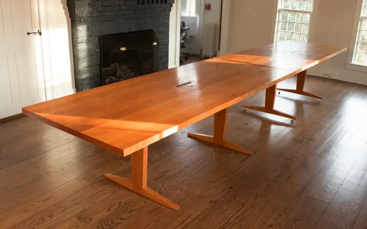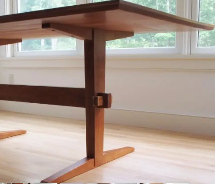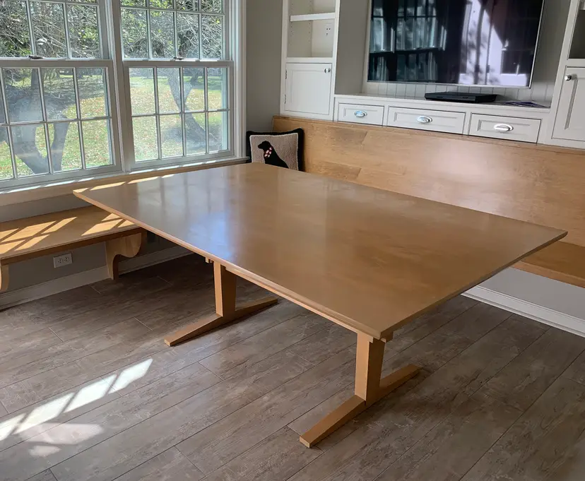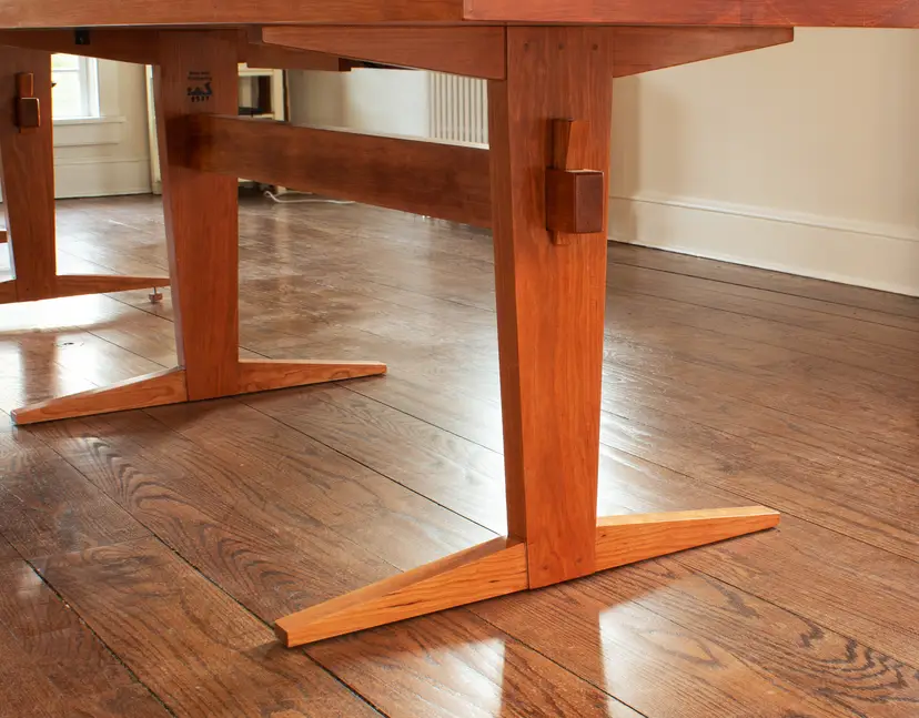 Trestle Leg Dining Table features angled components and bevels for strong shadow-lines. The 1¼ - 1½" top is sturdy has chamfered edges for a lighter look. Low-profile legs and a trestle cross support allow flexible seating. The trestles use wedges for full disassembly. Finished with 4 coats of hand-rubbed varnish.