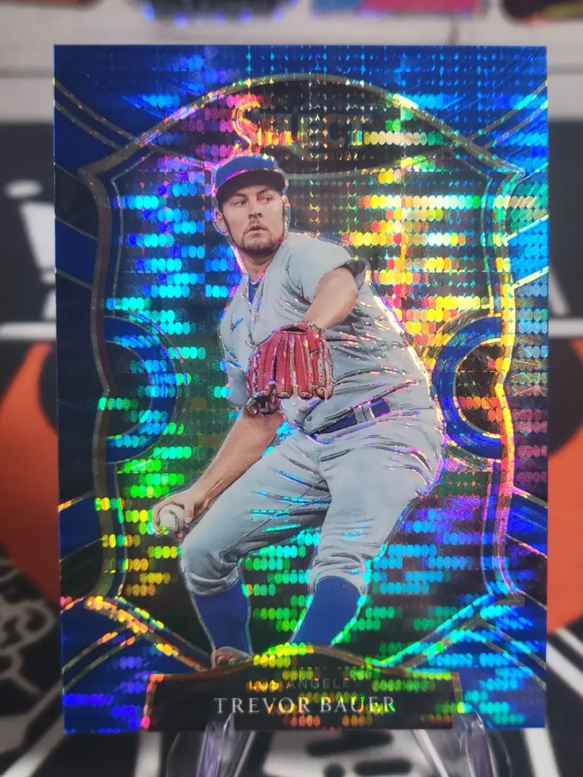 Trevor Bauer 2021 Panini Select Base Concourse Blue Pulsar /13. A striking parallel with vibrant Pulsar coloring and a very low serial number, this card stands out in any collection. Great addition for Select collectors or fans of unusual low-print parallels.