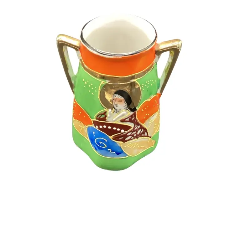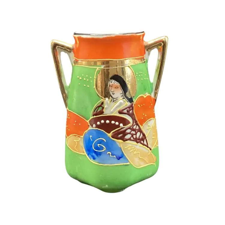 The Trico Hand Painted Bud Vase is a vintage piece made of SATSUMA Porcelain in Nagoya, Japan. This decorative vase features an all-over pattern with multi-color hand-painted designs, creating a unique and stylish addition to any home decor. The vase is signed by the artist making it a valuable collectible item for those interested in Japanese pottery and Asian-inspired designs. With its small size and delicate craftsmanship, this vase is perfect for displaying a single bloom or as a statement piece on a shelf or tabletop.