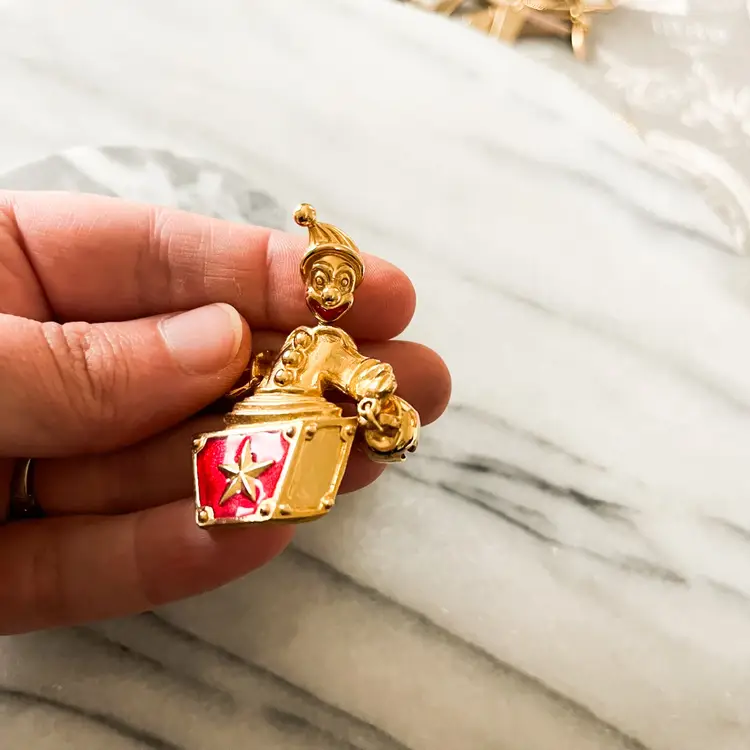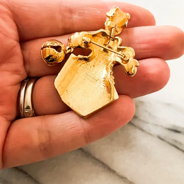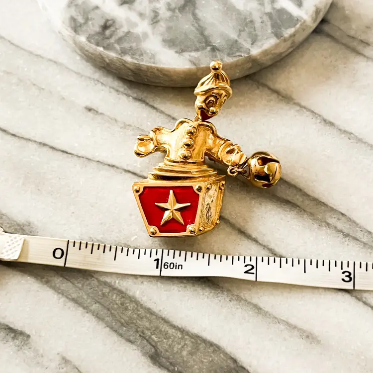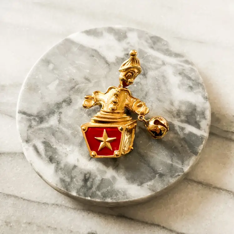 Trifari Clown Trembler Jack in the Box Clown Brooch Closure: Pin Colors: Gold toned metal red enamel Figural Signed Vintage Trifari Spring style trembler Bell accent