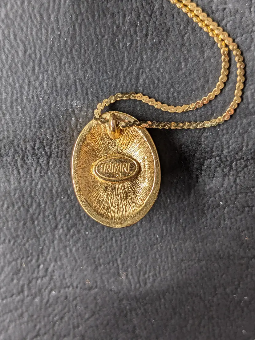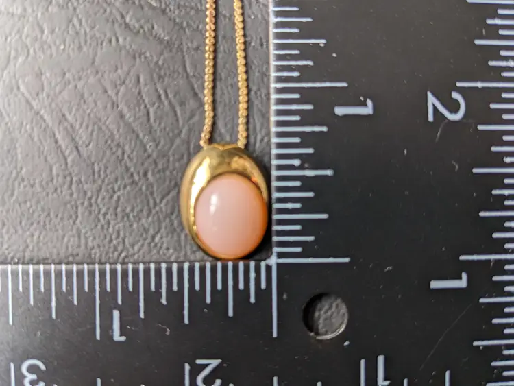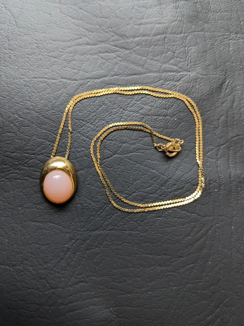 Perfect for Spring and Summer. Trifari Pink Oval Cabochon Necklace Gold Tone base metal Trifari mark on back of cabochon and Crown Trifari end of chain. See photos