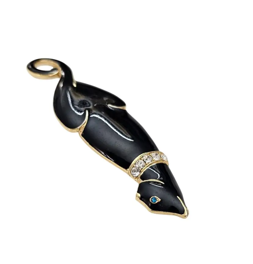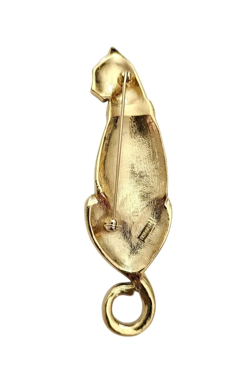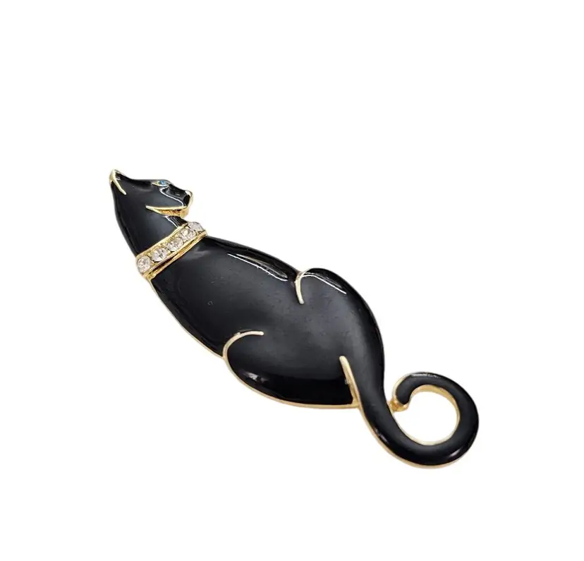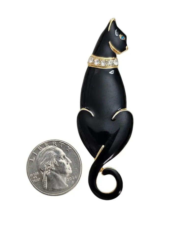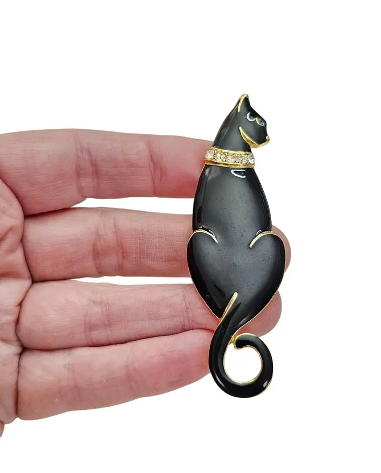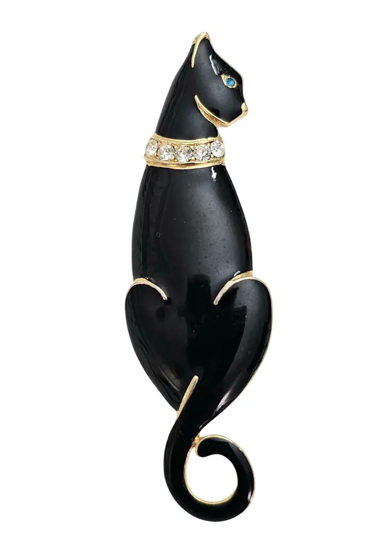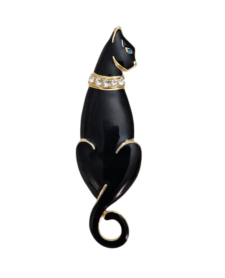 • Trifari TM Cat Brooch • Vintage 1980s Trifari costume jewelry • Radiant gold-tone base metal • Polished finish • Glazed black enamel details • Sitting cat back silhouette figural • Clear rhinestones pave-set on the cat's collar • Blue rhinestone set on the cat's eye • It measures approximately 3 inches in length • This pin is marked Trifari TM on the reverse • It has a straight pin mechanism with a rollover safety clasp, which can be firmly attached to your clothing • Good condition • C261