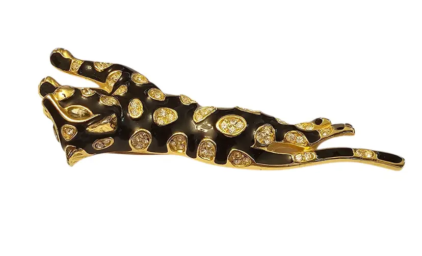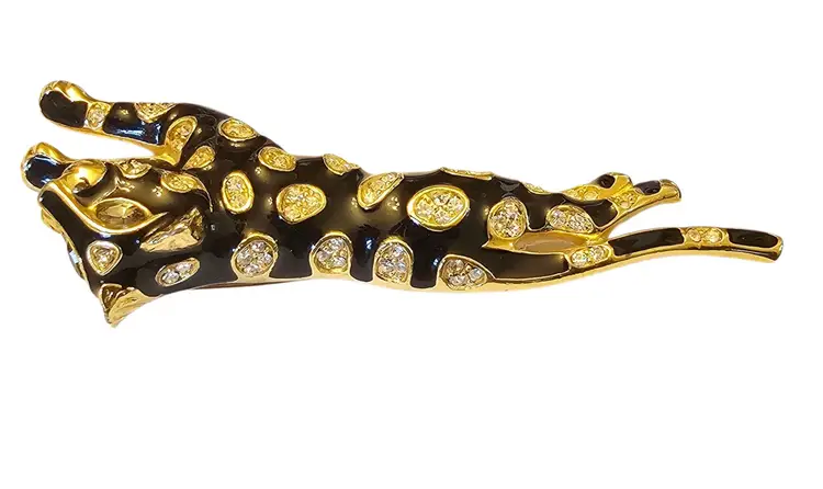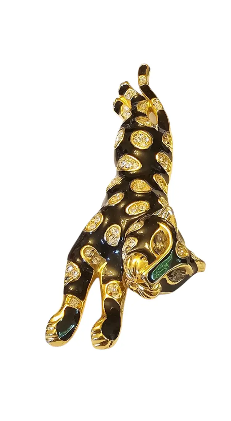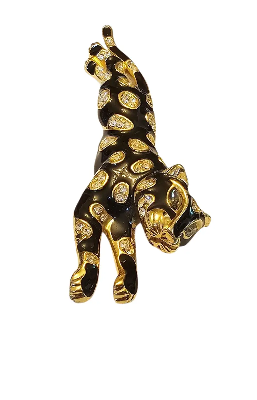 Trifari TM Black Enamel Rhinestone Wild Cat Leopard Tiger Panther Brooch Signed, C156