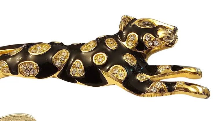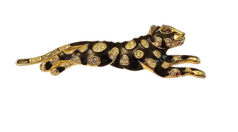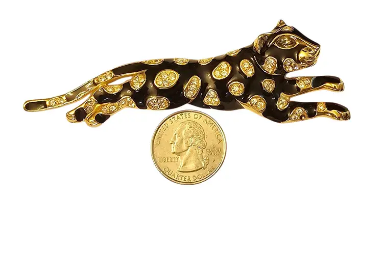 • Trifari TM Wild Cat Leopard Tiger Panther Brooch • Vintage 1980s Trifari costume jewelry • Radiant gold tone base metal • Polished finish • Black enamel details • Studded with clear rhinestones, depicting the cat's spots • Wild cat figural • It measures approximately 4 inches in length • This pin is marked Trifari TM on the reverse • It has a straight pin mechanism with a rollover safety clasp that can be firmly attached to your clothing • Good condition • C156