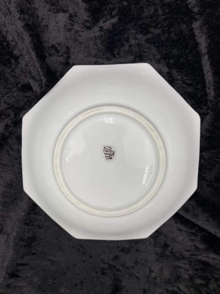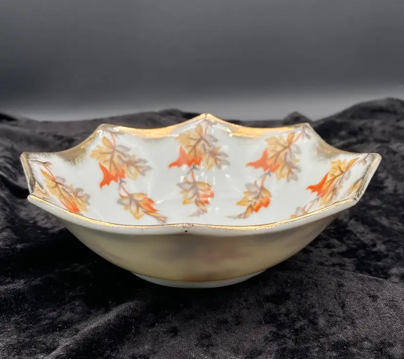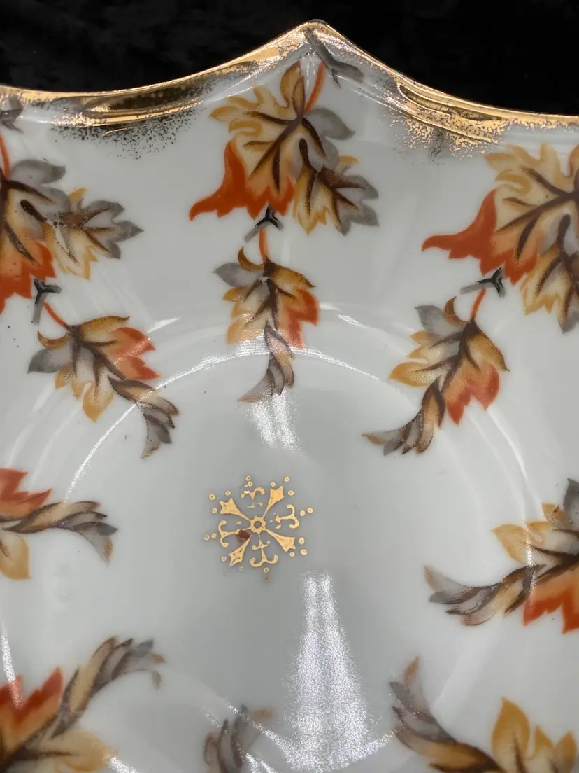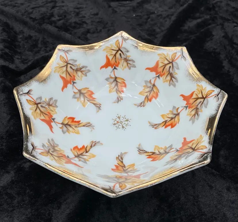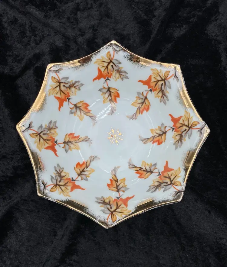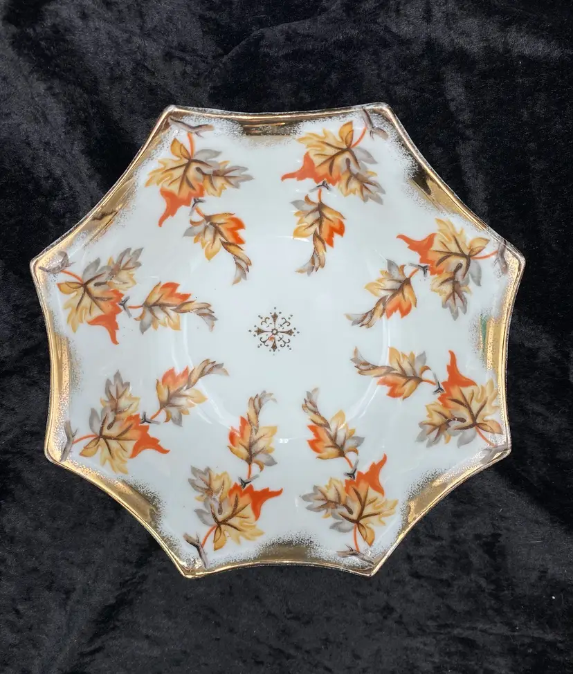 This Trimont Ware porcelain bowl from Japan features an elegant design with a fall leaf pattern and 22k gold trim. The octagonal shape and glossy finish add a touch of sophistication, making it perfect for serving or displaying autumn-themed items. Crafted in the 1980s, this original porcelain piece is lightweight at 11.2 ounces. It measures 2.2 inches tall and 7.4 inches wide (point to point). A portion of the original sticker remains on the base.