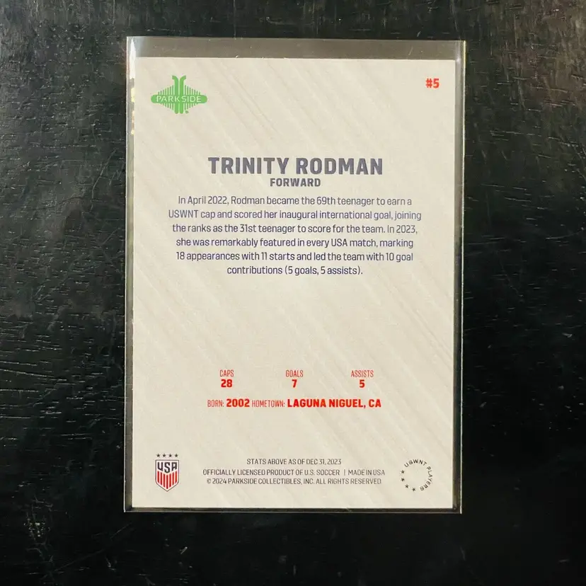 Card Size: Standard Set: 2023 Parkside USWNT Recap Year Manufactured: 2023 Player/Athlete: Trinity Rodman Original/Licensed Reprint: Original Type: Sports Trading Card Sport: Soccer Language: English Manufacturer: Parkside Features: Base Set Team: United States Card Number: 5 Season: 2023