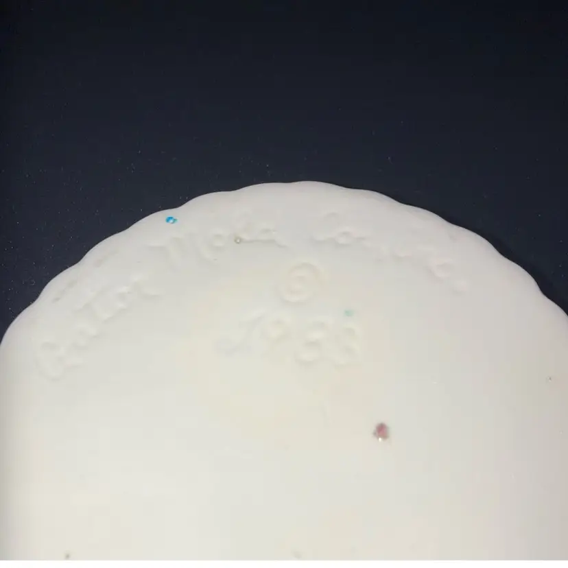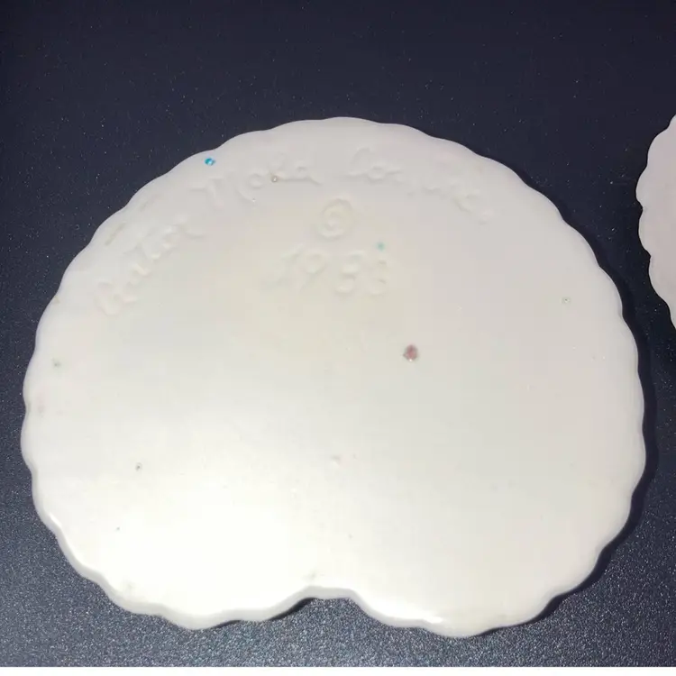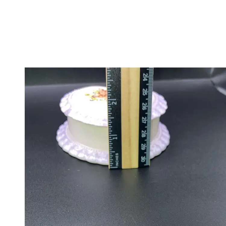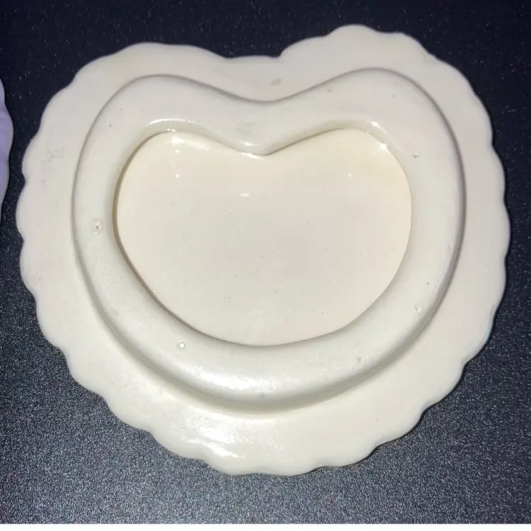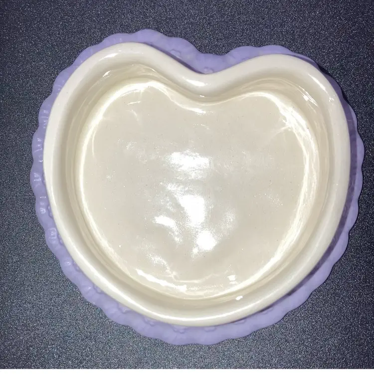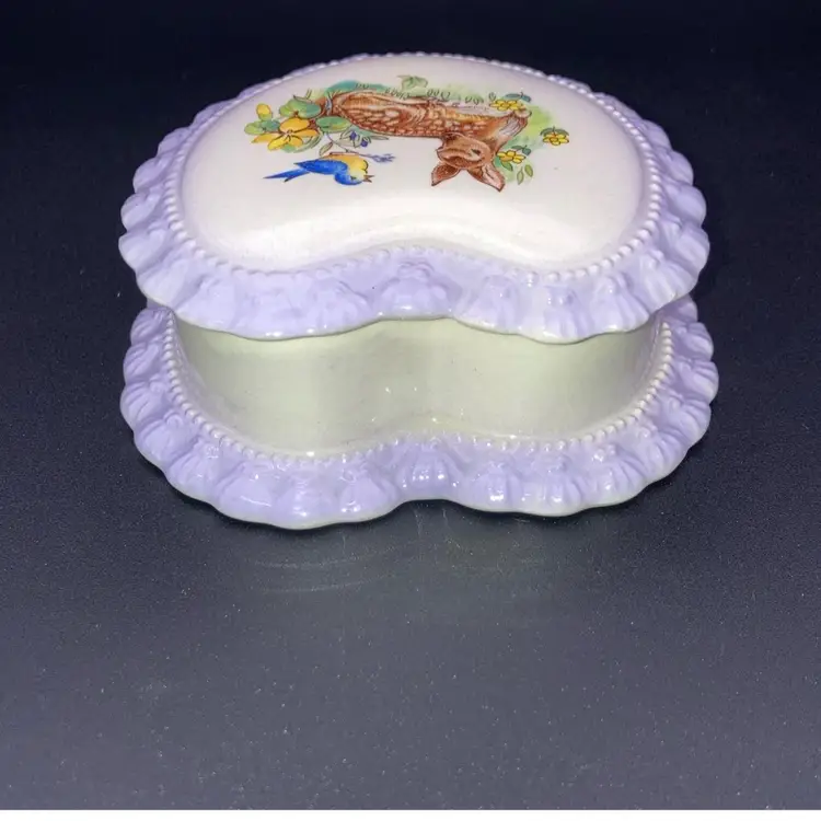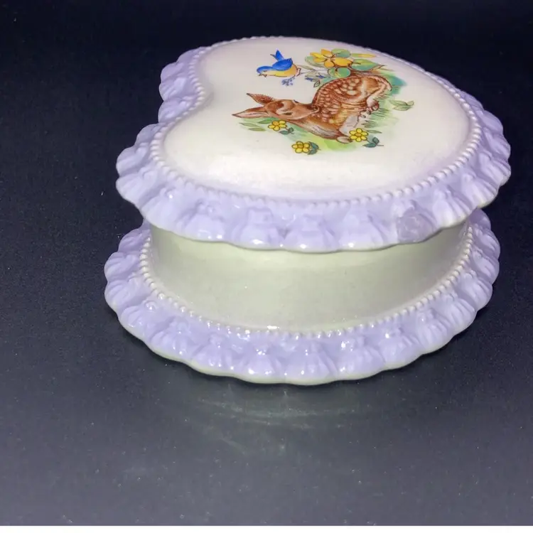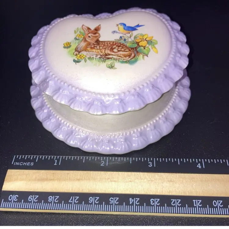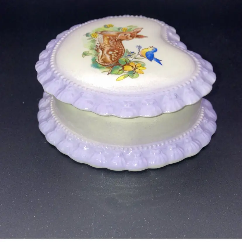 Vintage 1983 Gator Mold Co Inc. Lovely Lilac And White Heart Shaped Trinket Box! With A Bird And Deer Laying In A Meadow On It 4” Wide 1 1/2” Tall