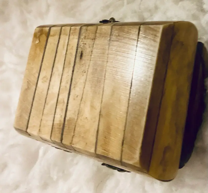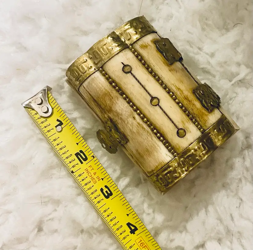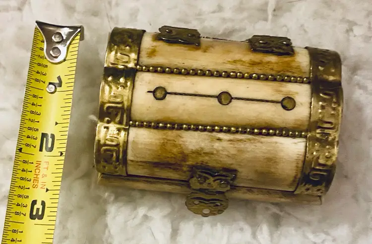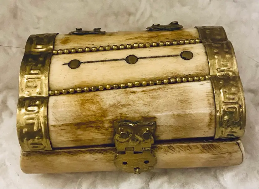 This is a vintage, handmade trinket or jewelry box crafted from bone (likely camel bone) with brass embellishments. The box features a distinctive, rounded lid and a rectangular base. It is adorned with ornate brass fittings, including decorative banding, studded details, hinges, and a latch. These types of boxes are often handmade in countries like India or Morocco. They are typically used for storing small items like jewelry, coins, or other keepsakes