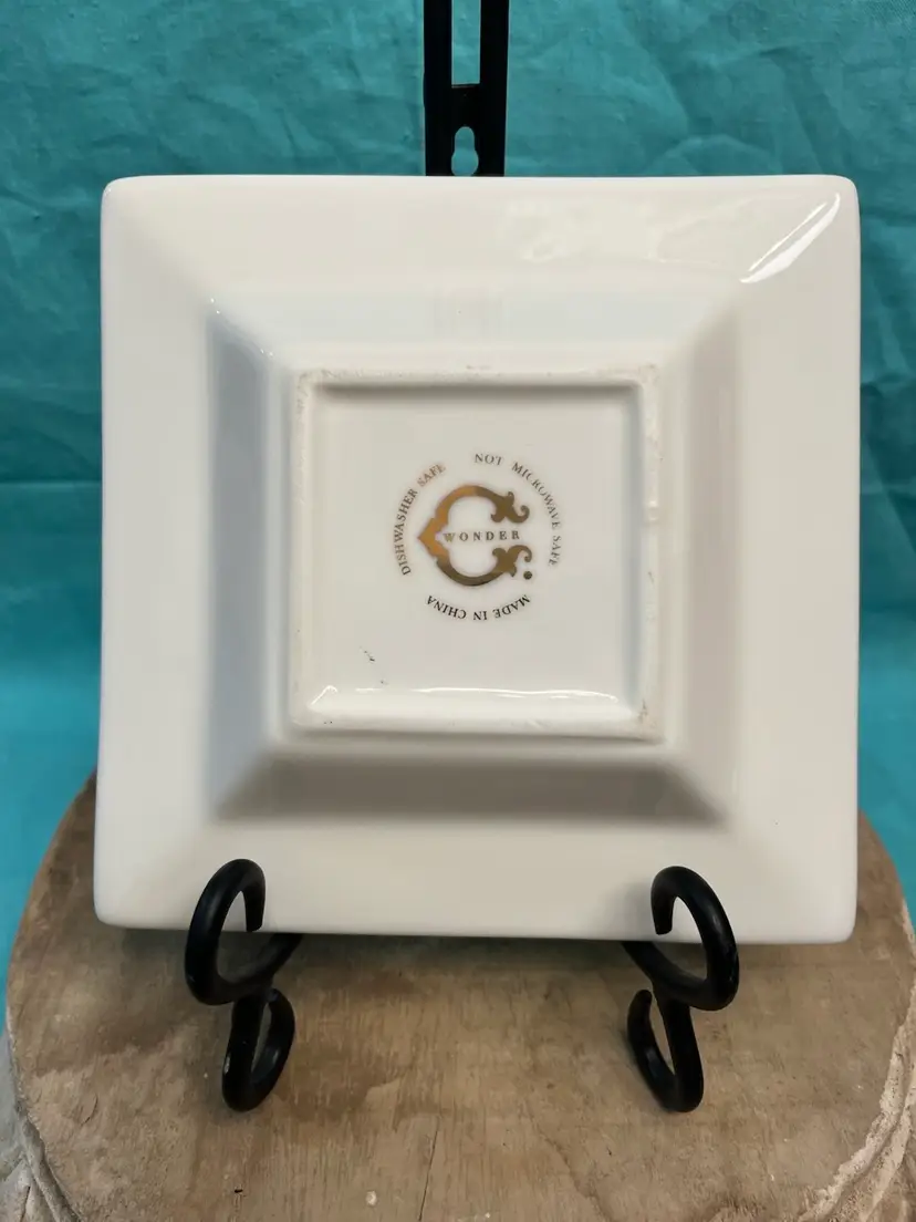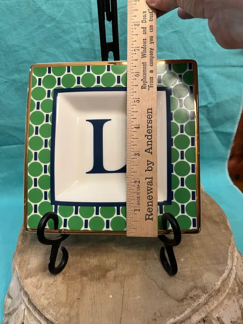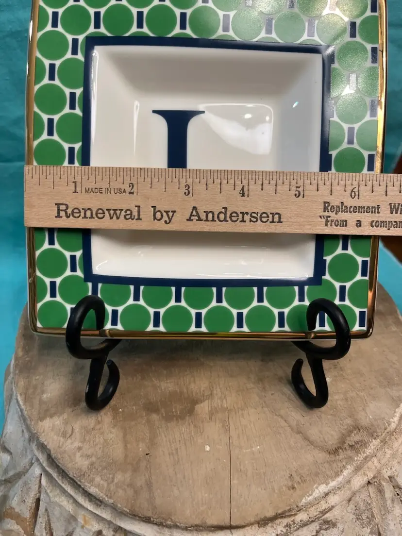 #299. Trinket Dish W/Initial “L” Green/blue Trimmed In Gold. Measures 6.5” made by Wonder in China. Little wear on gold in a few spots.